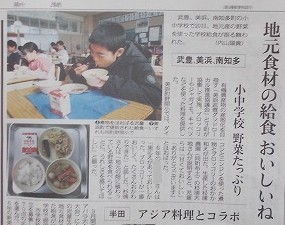 今日の給食は、有機栽培された地元産の野菜が使われていていました。それらの野菜を栽培している農家の方が野間小を訪れ、各学年に食材の紹介や、地元産の新鮮な野菜の素晴らしさを伝えてくださいました。野間小の今月の目標は、ちょうど「残さず食べよう」です。子どもたちはいつも以上においしさを感じながら食べていました。1/21(水)の中日新聞朝刊に記事が載っていますので、ぜひご覧ください。