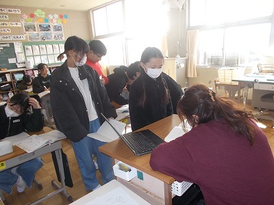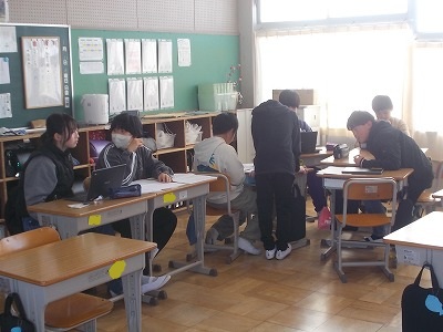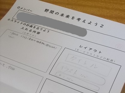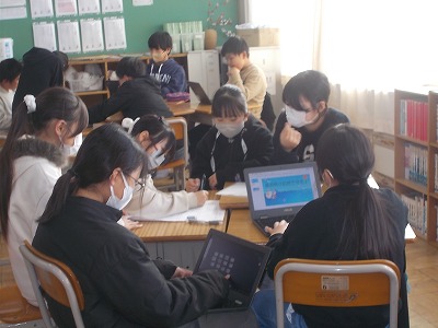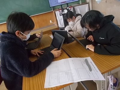 6年生は総合的な学習「野間の未来を考えよう」の学習です。グループに分かれて、スライドで取り上げる内容や、画面のレイアウトを考えていました。