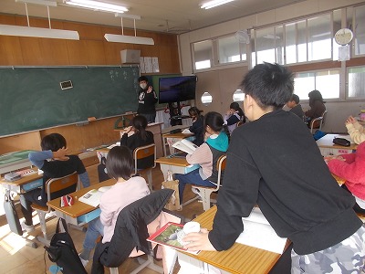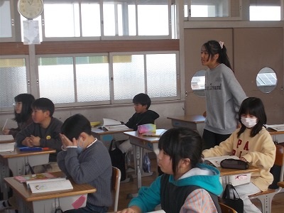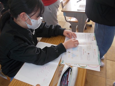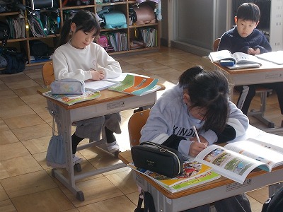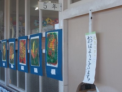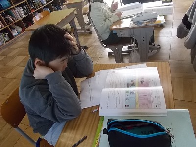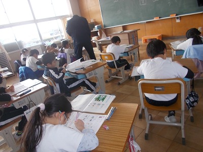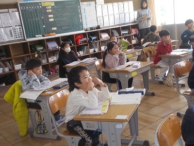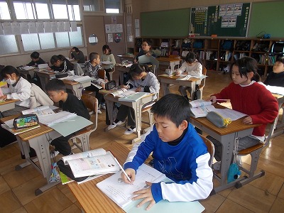 5年生は算数「円と正多角形」の問題練習をしていました。教科書の問題を解き、すべて終わった子はプリント問題にも挑戦しました。教室の出入り口には「元気な声で おはようございます」という、学級のめあてが掲示されてました。今朝のあいさつは、どうだったかな?