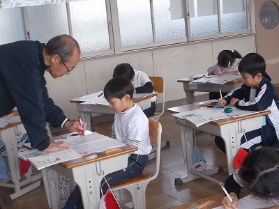 2年生は書写の授業です。「自」は縦の長四角に収まるように、「工」は横の長四角に収まるようにするなど、文字の形を意識して練習しました。