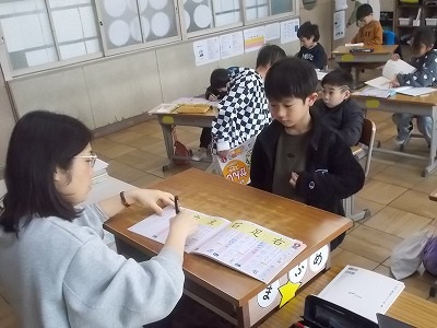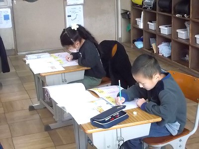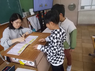 1年生は国語「もののなまえ」の学習をしています。授業の最初には、新出漢字の学習をしました。「力」「左」という漢字をドリルに丁寧に練習し、たくさんの子が「はなまる」をもらっていました。