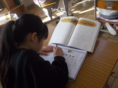 3年生は国語で「ありの行列」というお話を読み進めています。みんなで確認したり、個々にワークシートにまとめたりして、落ち着いた雰囲気で学習していました。