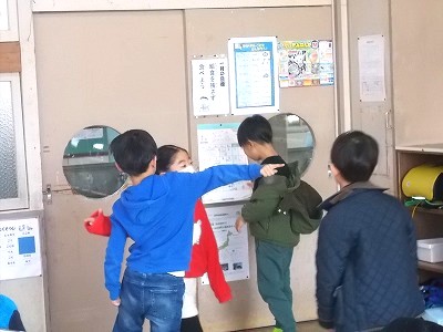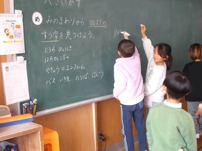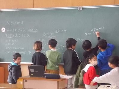1年生は算数「大きい数」の学習で、身の回りから100までの数を探して、黒板に書き出していました。教室内やお道具箱の中のものなどから、たくさんの数字を見つけ出していました。