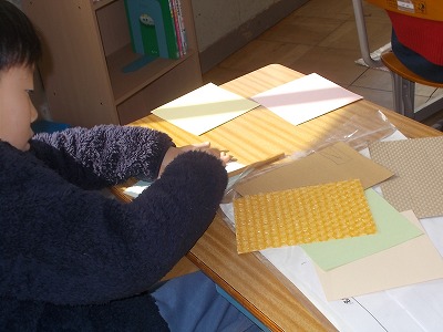 3年生は図工で紙版画に挑戦中です。いろいろな材料を切り取って台紙に貼り付けていきます。どんな模様が出てくるかを考えながら、作業を進めていきました。