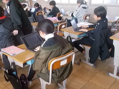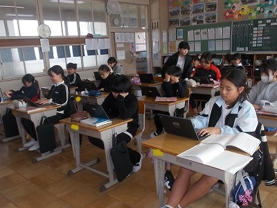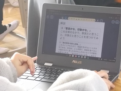 5年生は国語「想像力のスイッチを入れよう」の学習です。事実と意見の関係をおさえ、考えを発表できるようにします。各自で考えたテーマに沿って、入力中でした。
