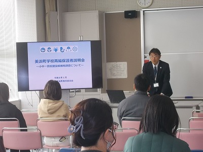 また、授業公開の後、「美浜町学校再編保護者説明会」が開催され、美浜町長様から経緯や方針等の説明がありました。こちらにもたくさんのご参加をいただき、ありがとうございました。