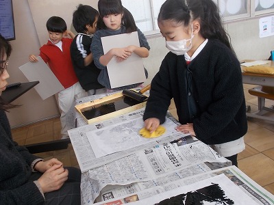 1年生は図工で版画に取り組んでいます。版が完成した子は、ローラーでインクをつけ、馬連を使って和紙に印刷をしました。うまく絵柄が印刷できたかな?