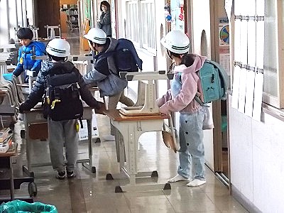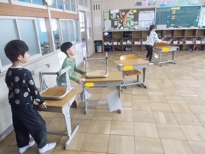 先週の金曜日にワックスがけをしたので、今朝は朝一番に机などを教室に戻しました。早く来た子から、協力して作業してくれました。重い机を運ぶ先生を手伝う、優しい姿も見られました。