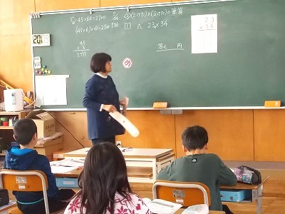 3年生は算数で、2桁×2桁の筆算について学習しました。「23×34」の計算の仕方を、みんなで考えています。先生や黒板の方をきちんと見て、一生懸命考えている子がたくさんいました。