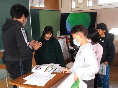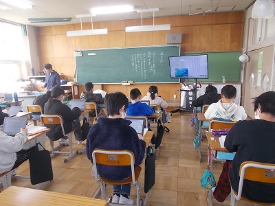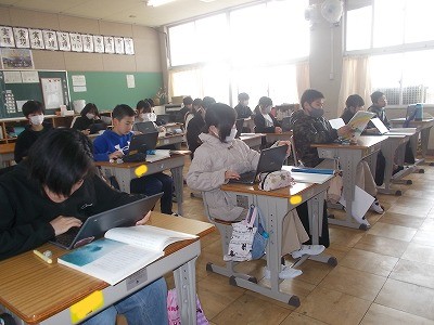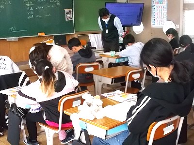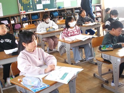 5年生は算数で、速さと時間から道のりを求める学習をしました。「3時間30分」を「3.5時間」にして計算するなど、戸惑う部分もありましたが、担任の先生やTTの先生に質問しながら、一生懸命考えていました。