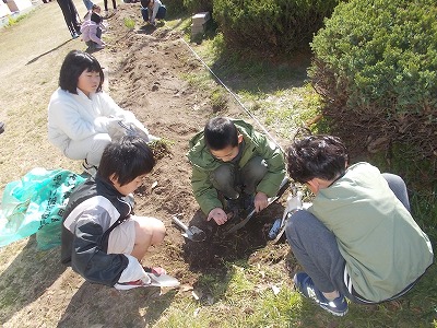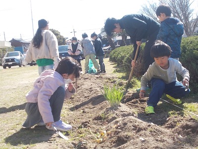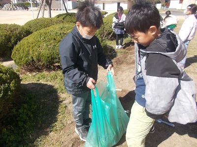 2年生は学年の花壇の草を抜きました。温かくなってきたので、草が一斉に生え始めています。みんなで協力して、たくさんの草を抜きました。