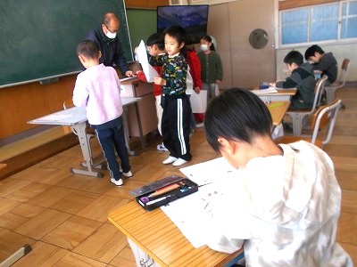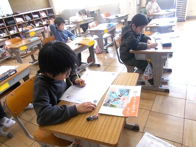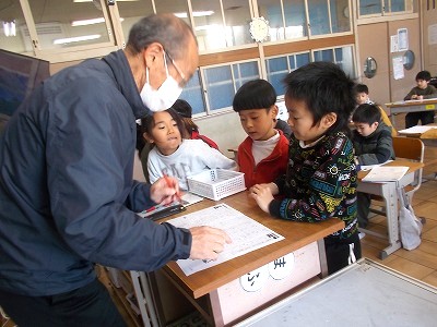 1年生は書写の授業です。丁寧に書いて、先生に見てもらいます。花丸がもらえるかな……?