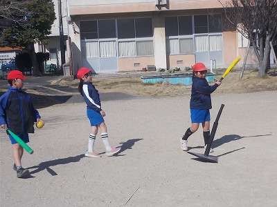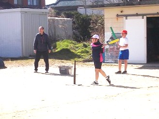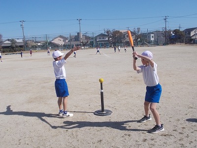 3年生の体育です。打つ方はだいぶ上手になってきましたね。キャッチの方は……?なかなか難しいようでした。
