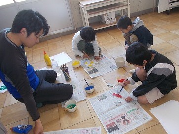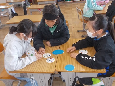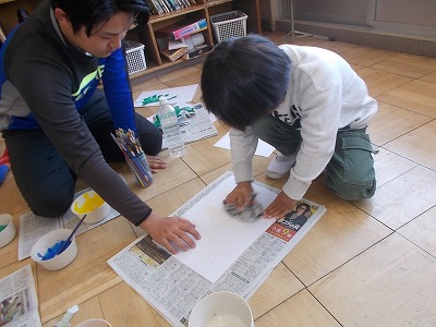 2年生の図工です。版画の続きに取り組みました。完成した子は教室の後ろで絵の具を塗って、印刷しました。色とりどりの作品ができあがりそうです。