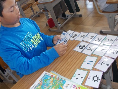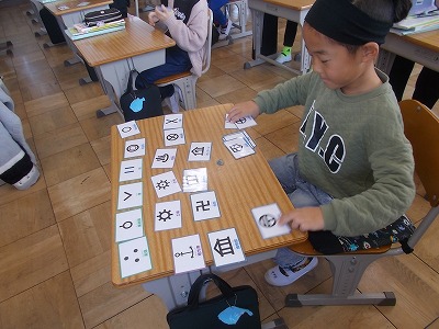 3年生は社会科で、地図記号の復習です。地図記号が示されたカードを使いました。すらすら言える子がたくさんいました。1学期に覚えた知識が、しっかりと残っていますね。