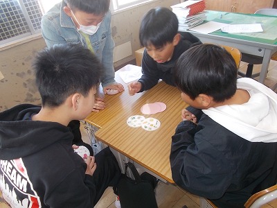 4年生は外国語の授業です。「ドグル」というゲームで、2枚のカードに共通して描かれた絵を素早く見つけ、英語で答えます。どのグループも大盛り上がり。とても楽しく、積極的に学習していました。