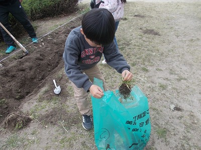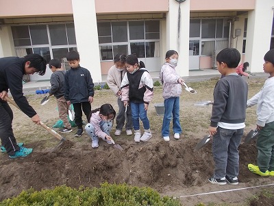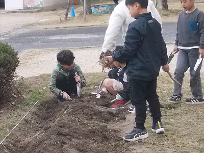 2年生は花壇の整備をしました。耕したり、混ざっている草を取り除いたりしています。