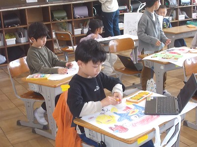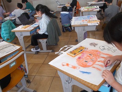 1年生は図工で、作品を入れる袋にイラストを描きました。どの子も大きく堂々と描いていて、素晴らしい作品袋になりそうです。