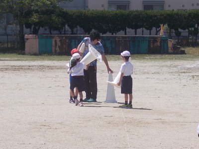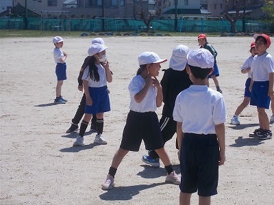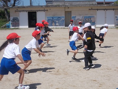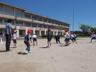 2年生は運動場で体育の授業です。「体ほぐしの運動遊び」の学習で、「ねことねずみ」を行いました。ねこチームとねずみチームに分かれ、「ねこ!」「ねずみ!」と言われた方が追いかけます。とても楽しそうに活動していました。
