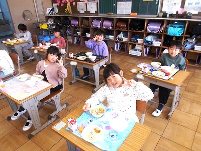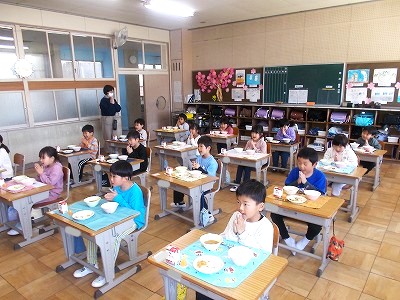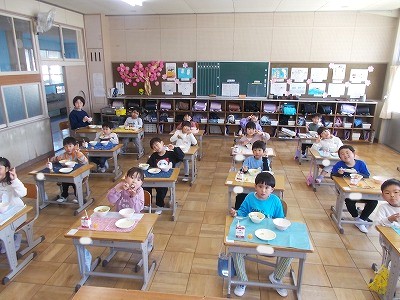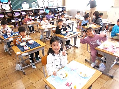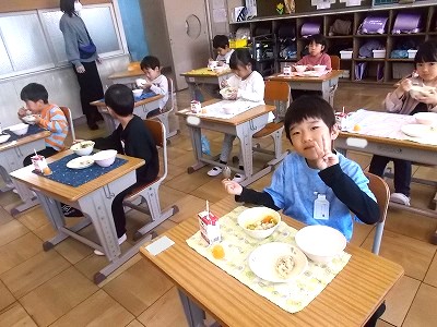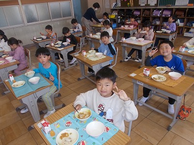 1年生は今日から給食がスタートしました。初めての給食は、カレーライス。ゼリーもついていました。みんなでそろって「いただきます!」 小学校でみんなで食べた給食の味は、どうでしたか?