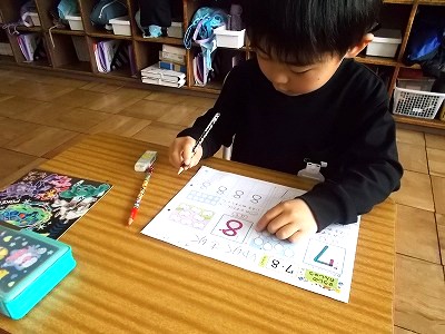 1年生の算数です。今日は7と8について学習しました。「8」の数字は形もバランスもちょっぴり難しいかな?でもプリントに丁寧に練習して、上手に書けるようになりました。