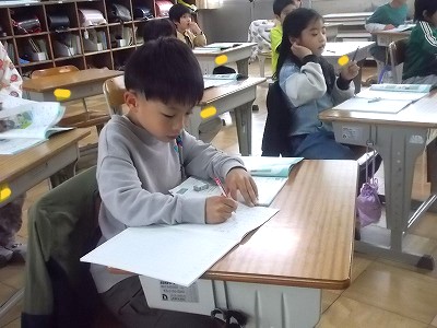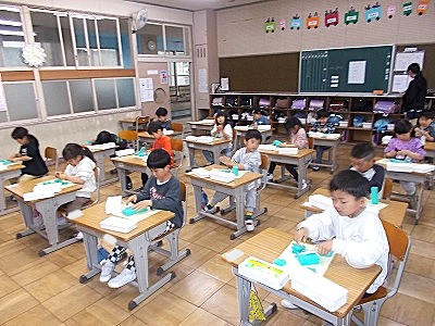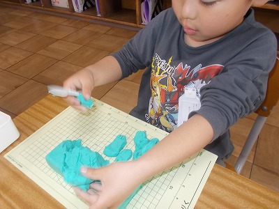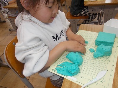 1年生は粘土で思い思いの作品を作っていました。生き物を作ったり、キャラクターを作ったり、中にはブランコを作っている子や、神社の鳥居を作っている子もいました。個性が出ますね。