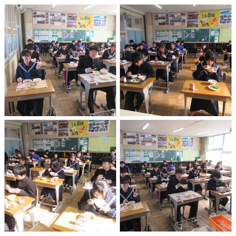1年B組 給食の様子 投稿日時: 2026年1月21日 投稿者: 野間中学校 1年B組の今日の給食の様子です。メニューは、麦ご飯、麻婆豆腐、餃子、小松菜ともやしのナムルでした。生徒たちは、落ち着いた雰囲気の中で、おいしそうに給食を食べていました。