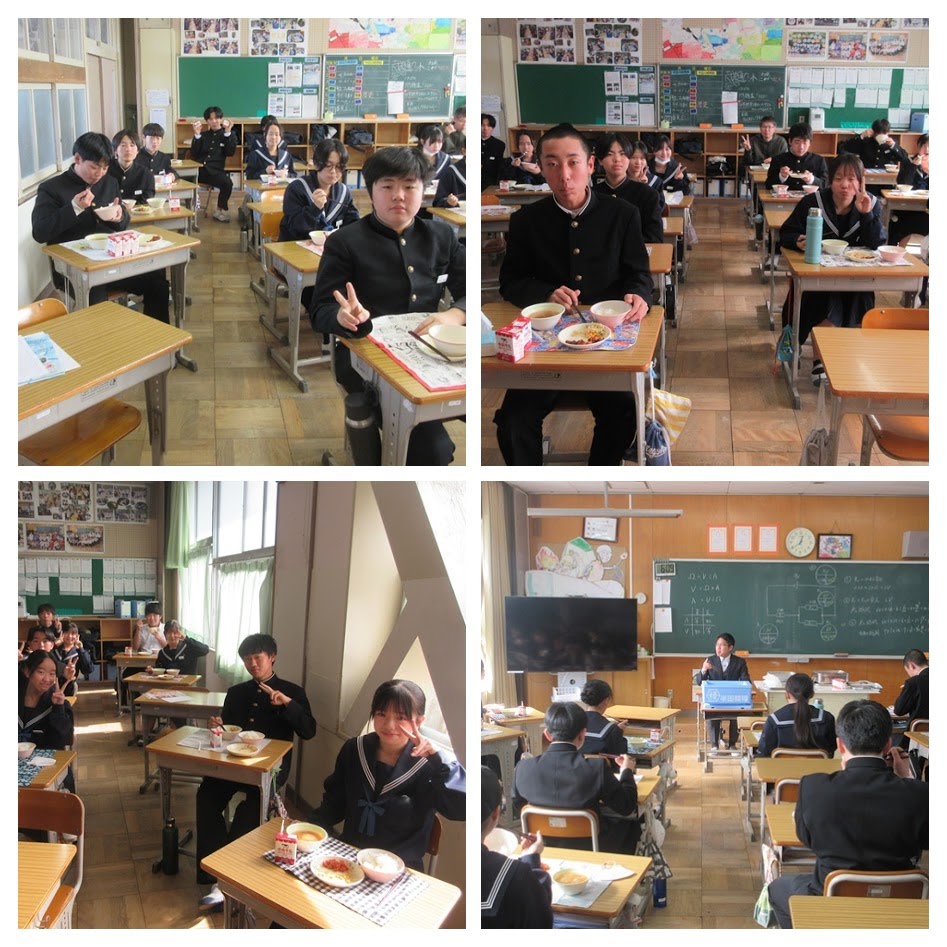 2年B組の給食の様子です。今日の「学校給食週間」のテーマは、和歌山県の美浜(みはま)町でした。マグロのはえ縄漁が有名な地域ということで、給食には「マグロとじゃがいものチリソースがけ」が登場しました。元気な生徒が多く、教室はにぎやかな雰囲気。みんな楽しそうに給食を食べていました。