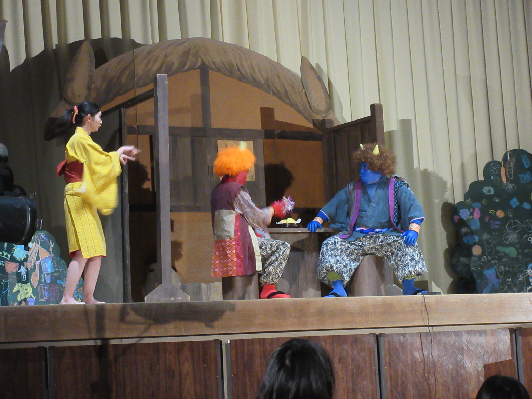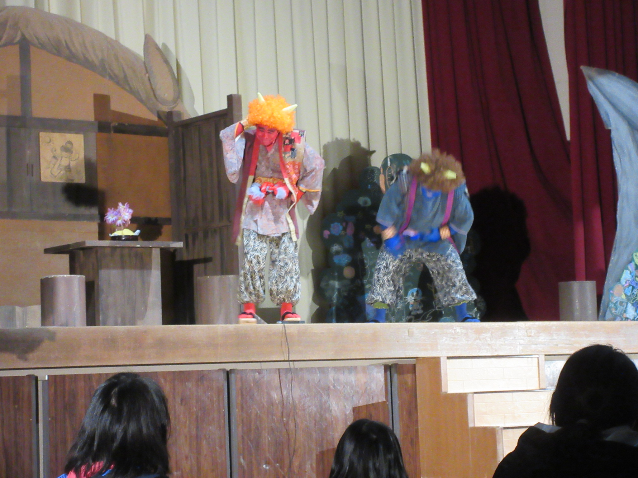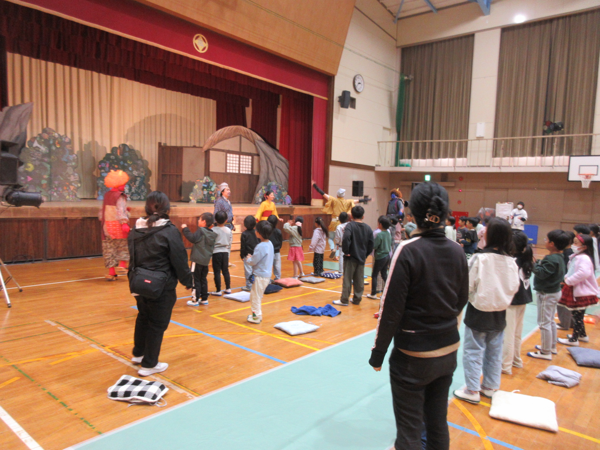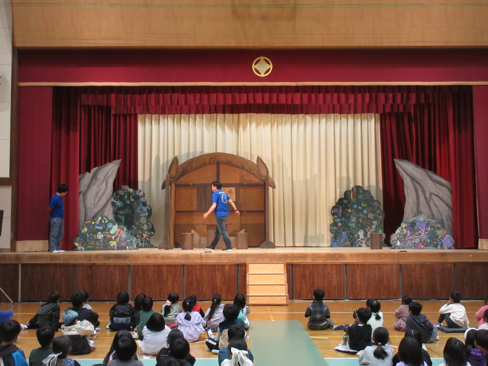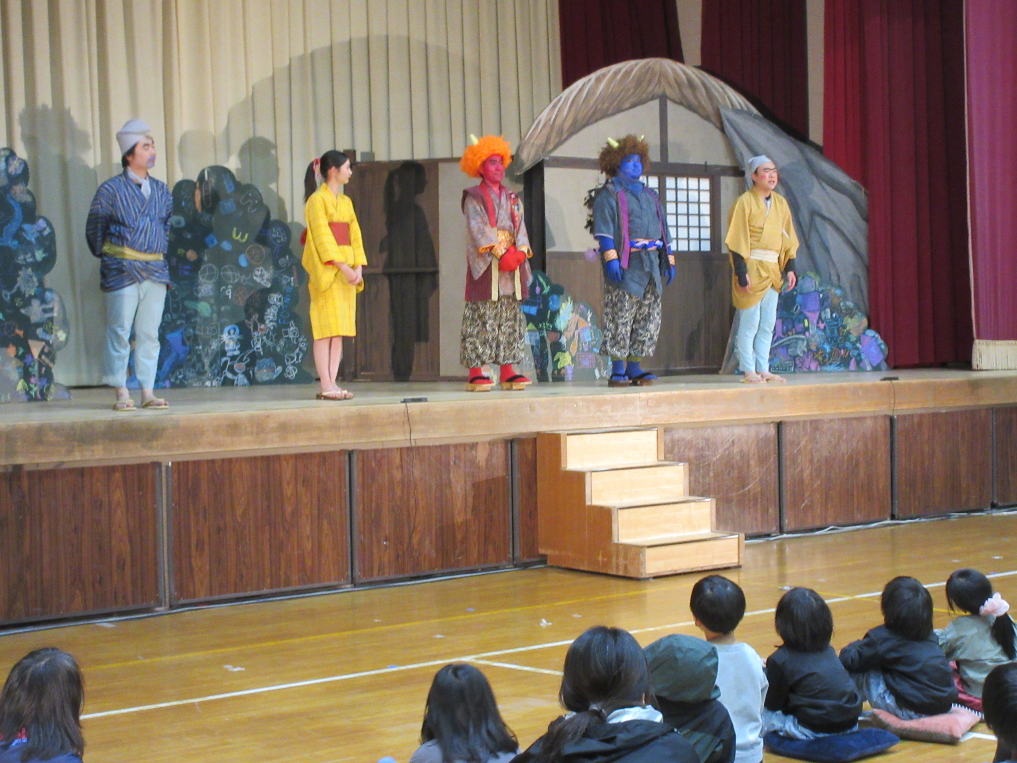 午後は「ないたあかおに」の演劇鑑賞です。午前中に子どもたちが描いた絵が、舞台の一部となって登場しました。劇に合わせて手拍子したり、「あそこがあかおにの家だよ」と声にしたりと、子どもたちは演劇を思う存分楽しんでいました。