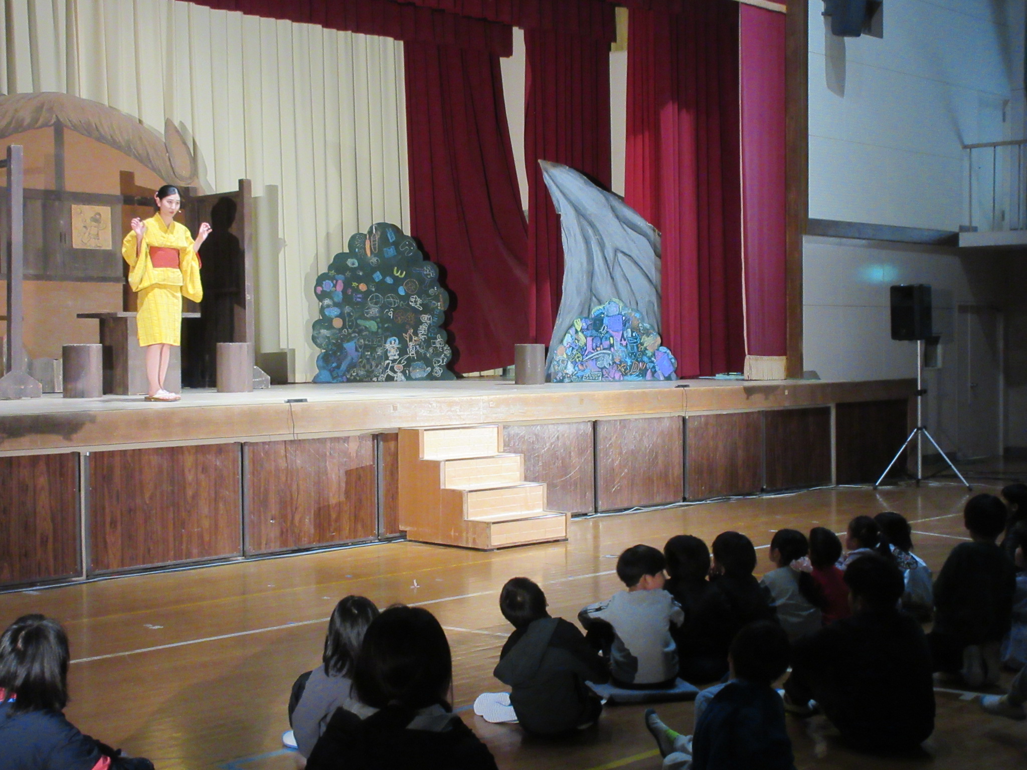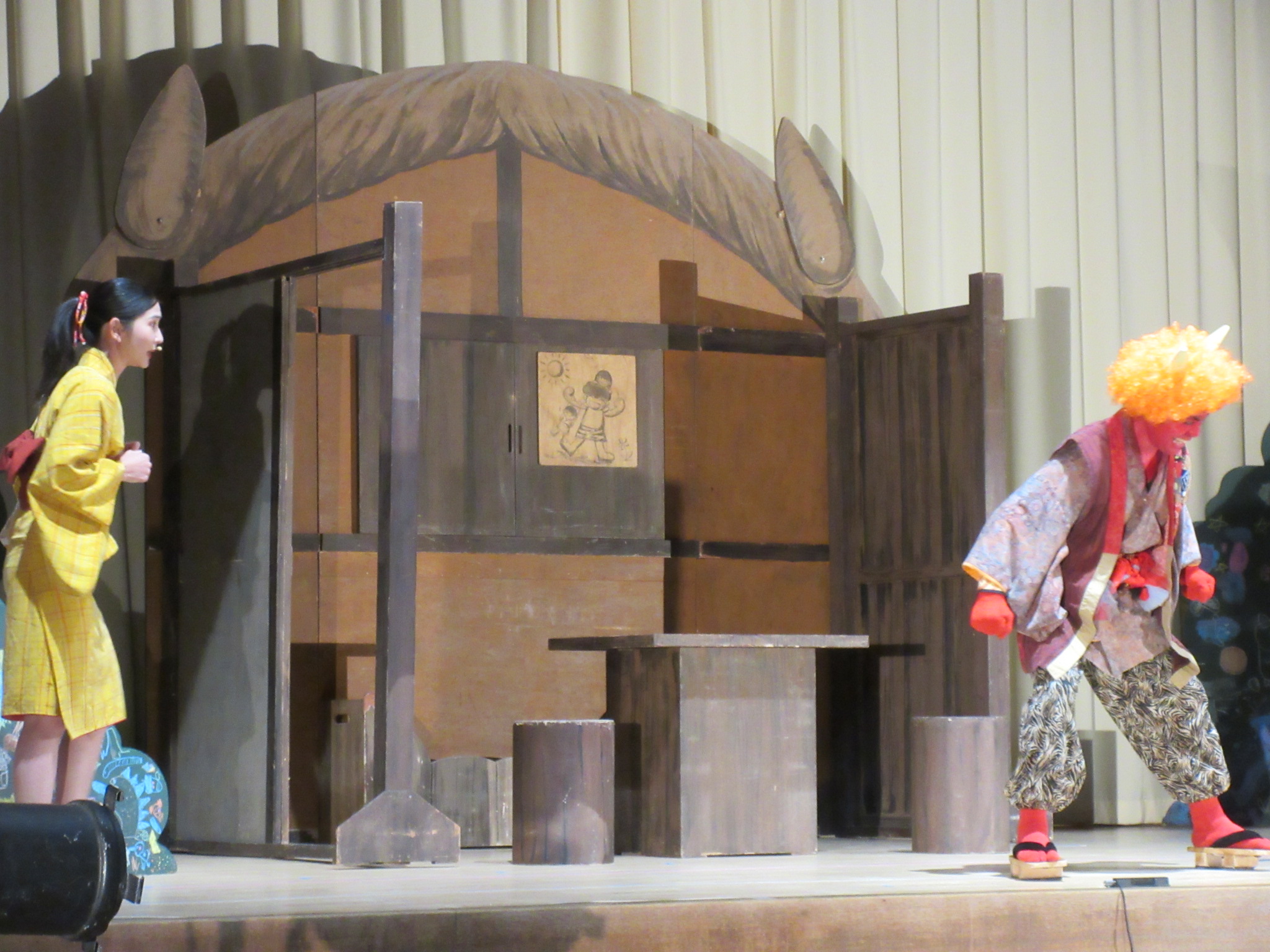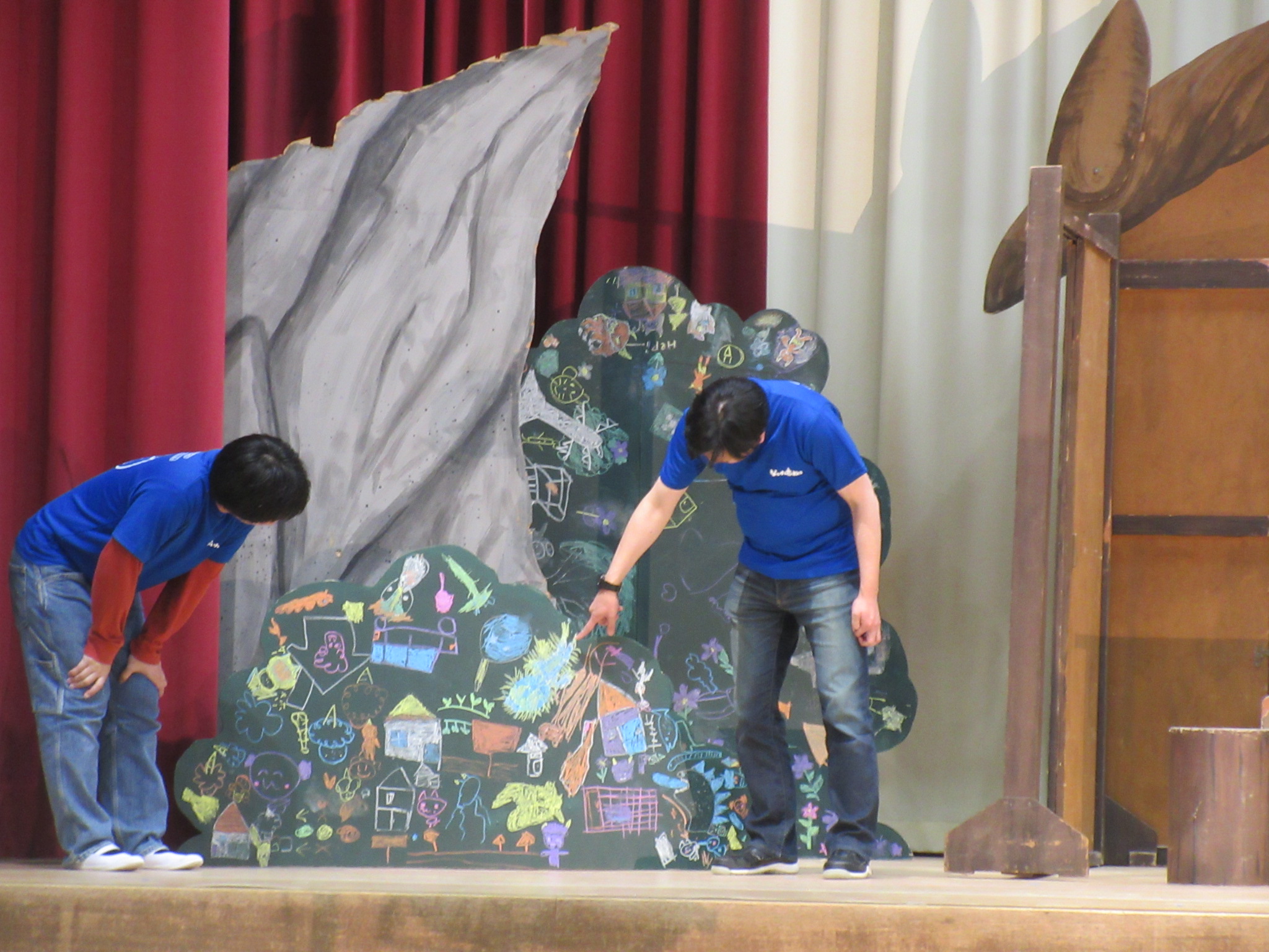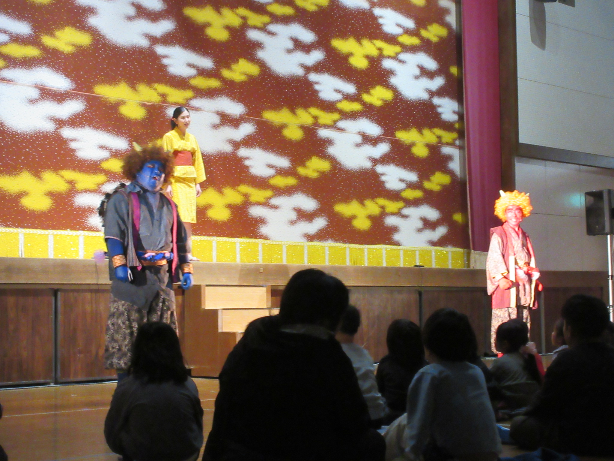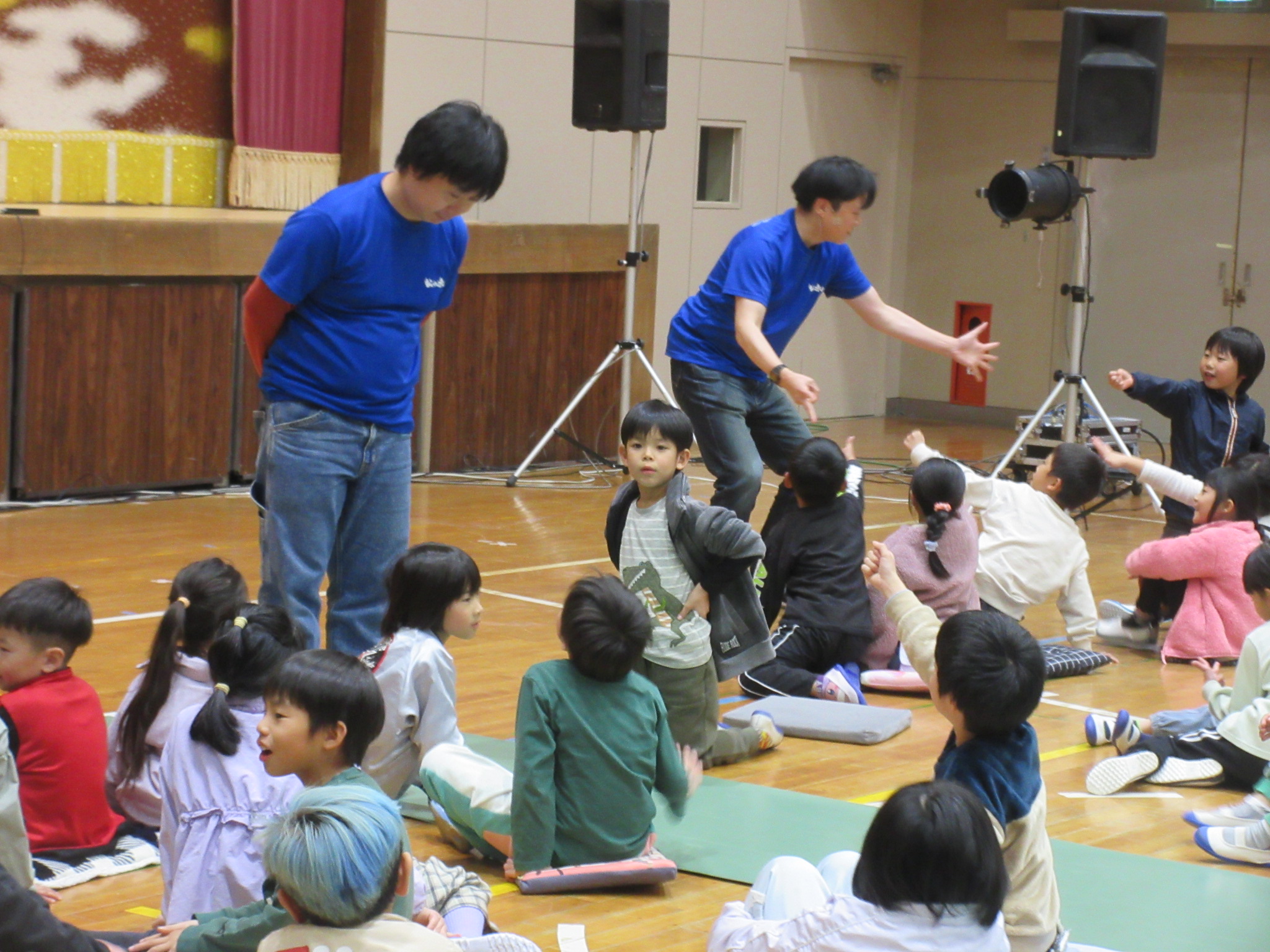 午後は「ないたあかおに」の演劇鑑賞です。午前中に子どもたちが描いた絵が、舞台の一部となって登場しました。劇に合わせて手拍子したり、「あそこがあかおにの家だよ」と声にしたりと、子どもたちは演劇を思う存分楽しんでいました。