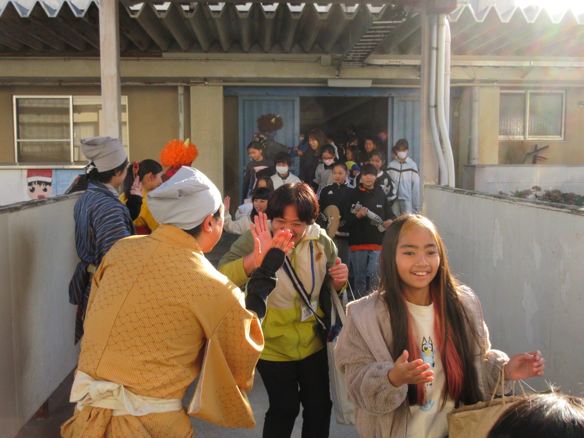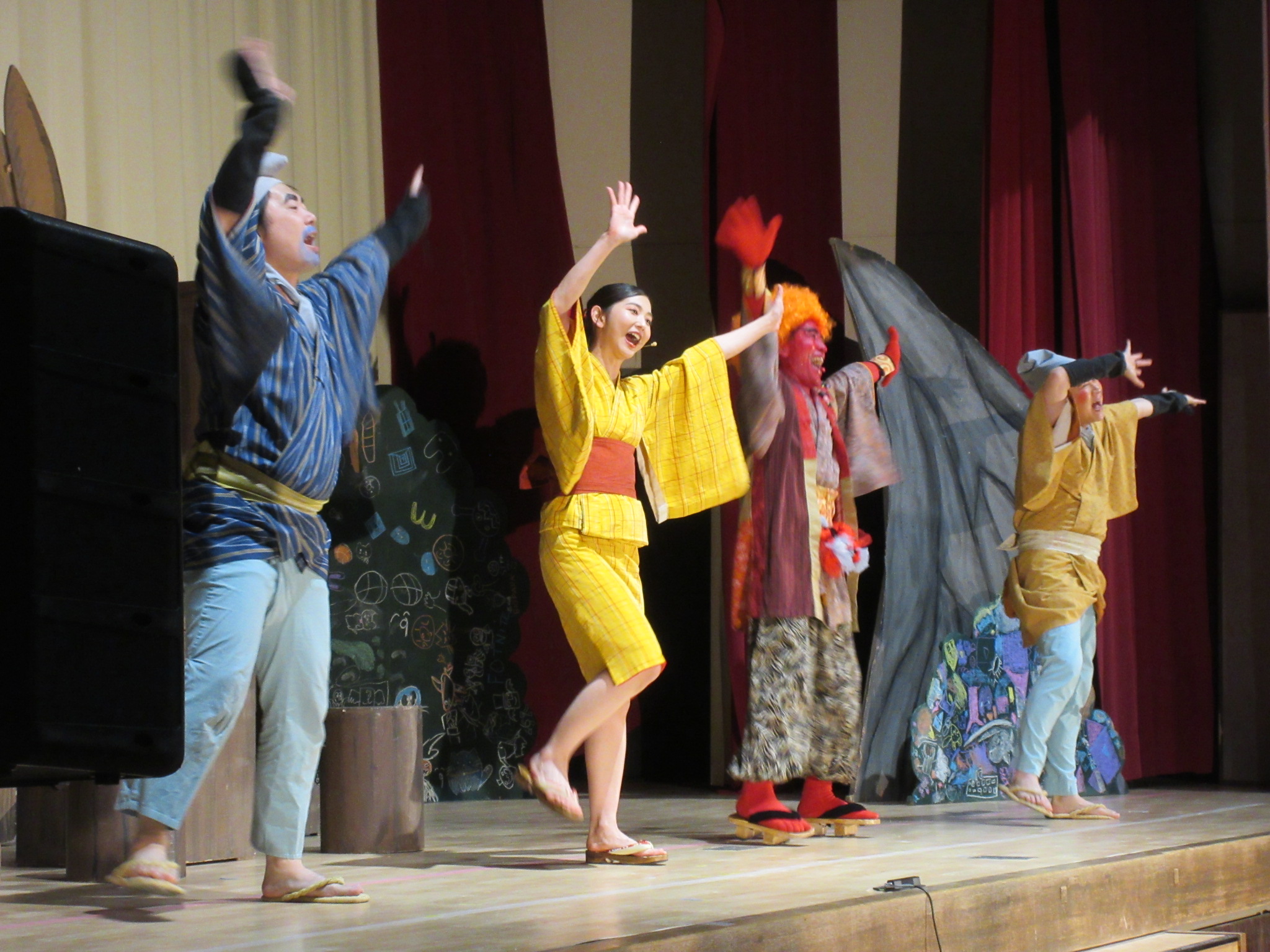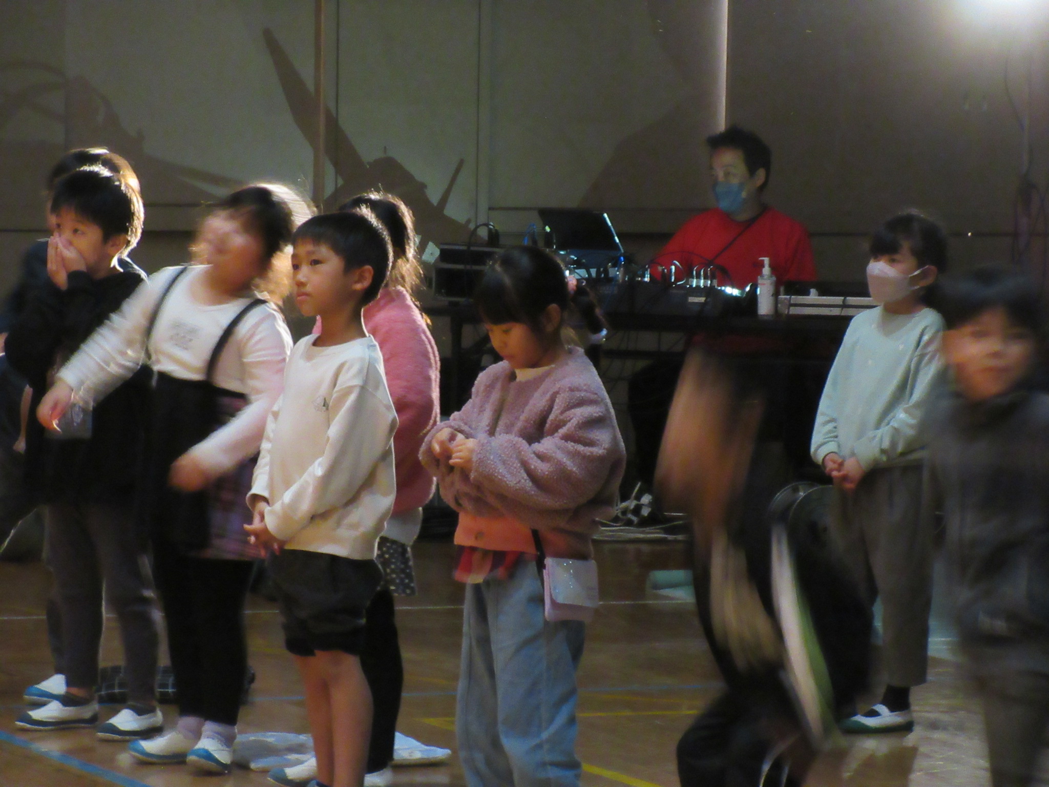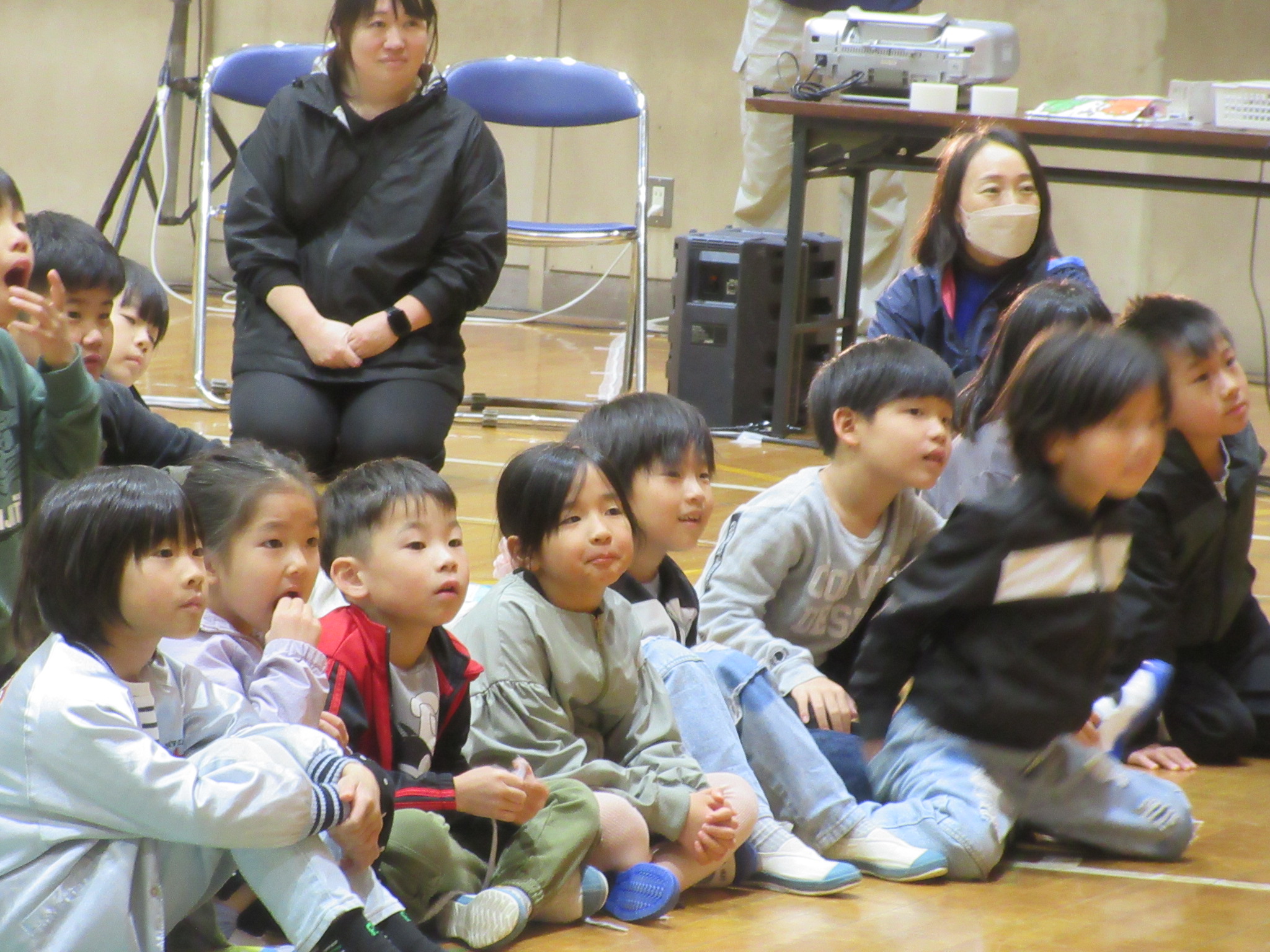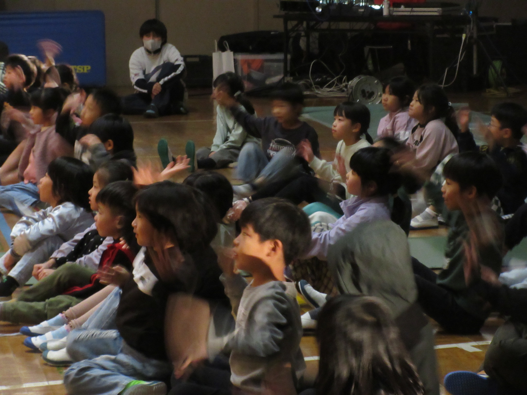 午後は「ないたあかおに」の演劇鑑賞です。午前中に子どもたちが描いた絵が、舞台の一部となって登場しました。劇に合わせて手拍子したり、「あそこがあかおにの家だよ」と声にしたりと、子どもたちは演劇を思う存分楽しんでいました。