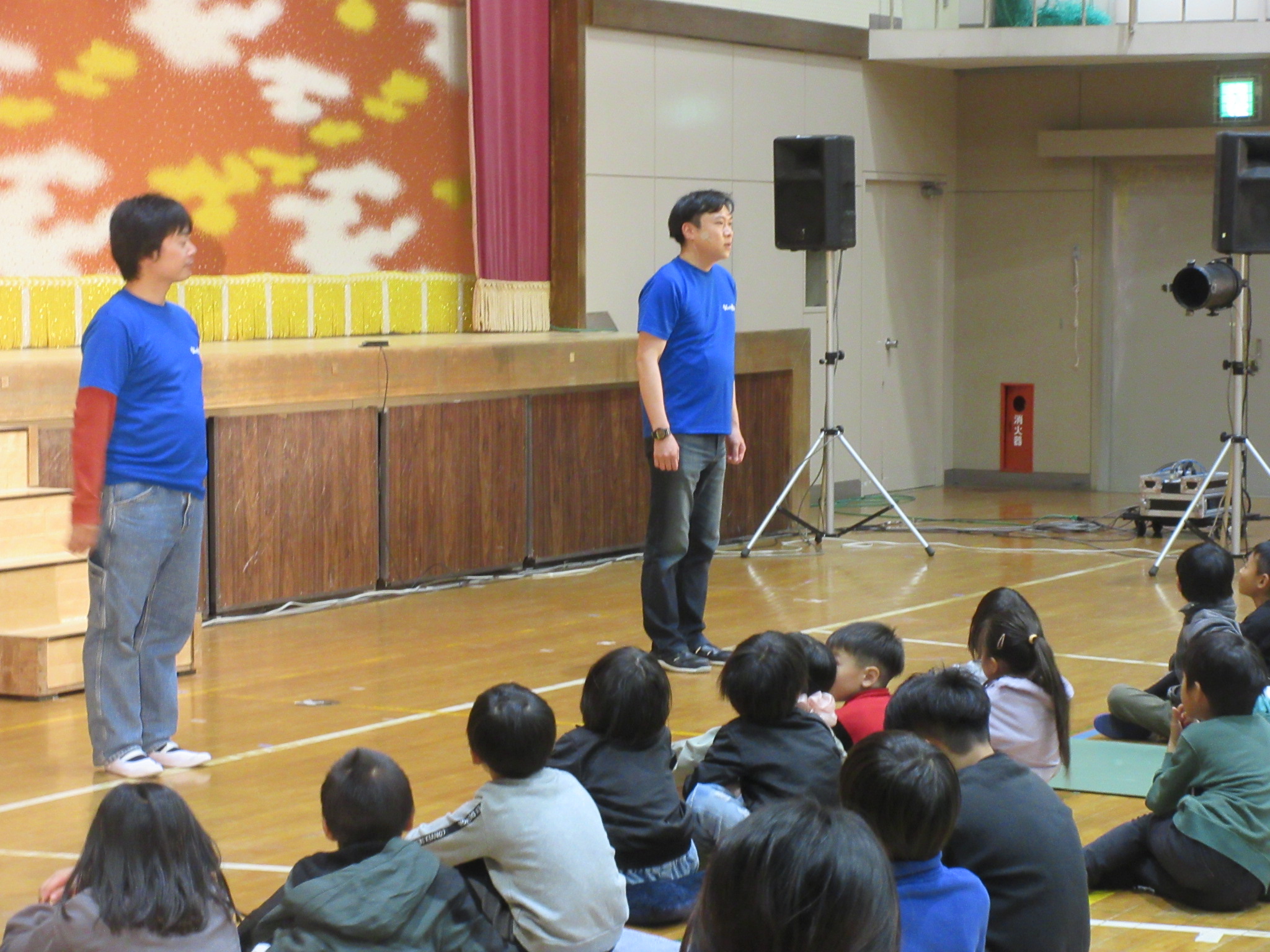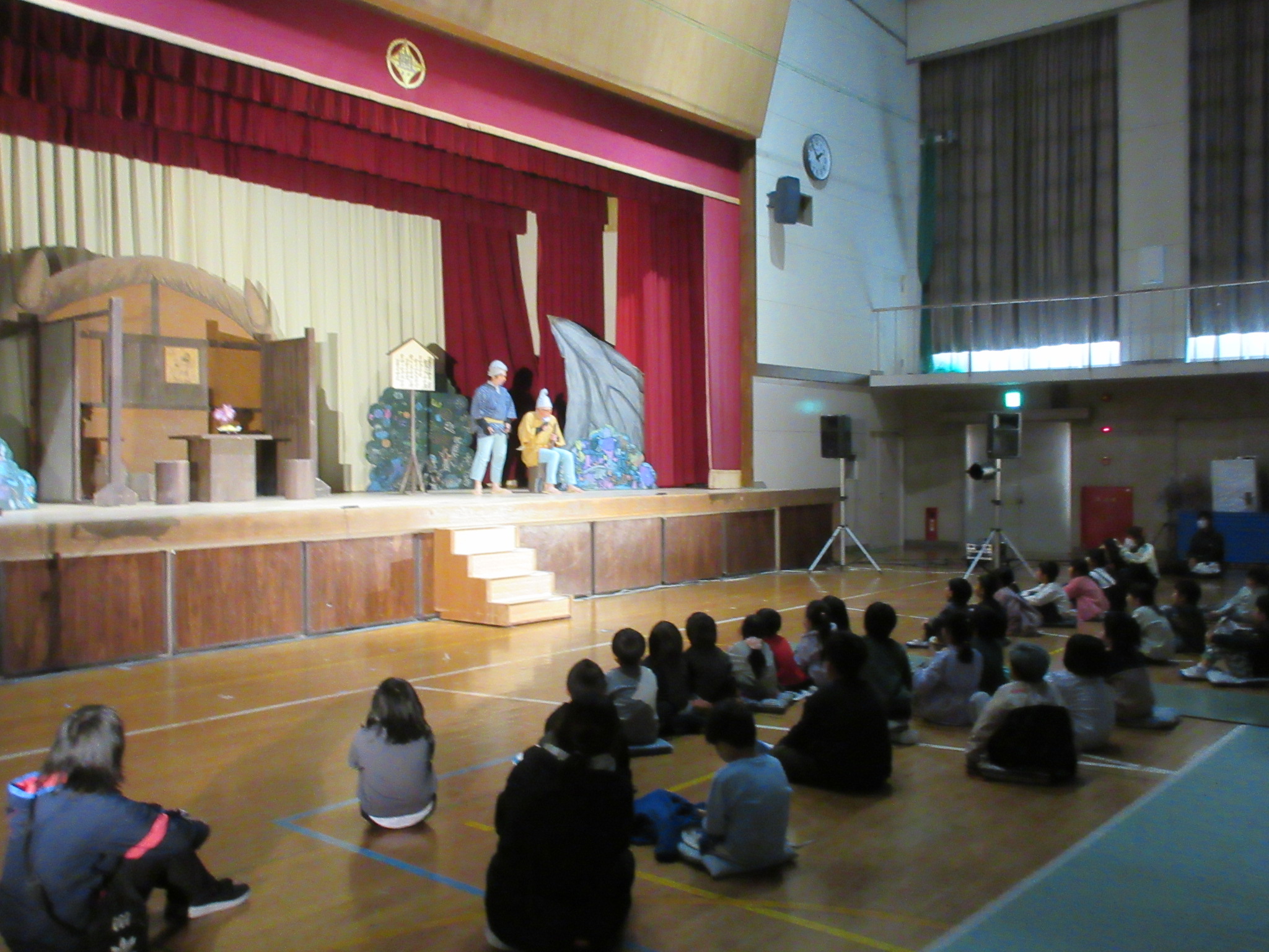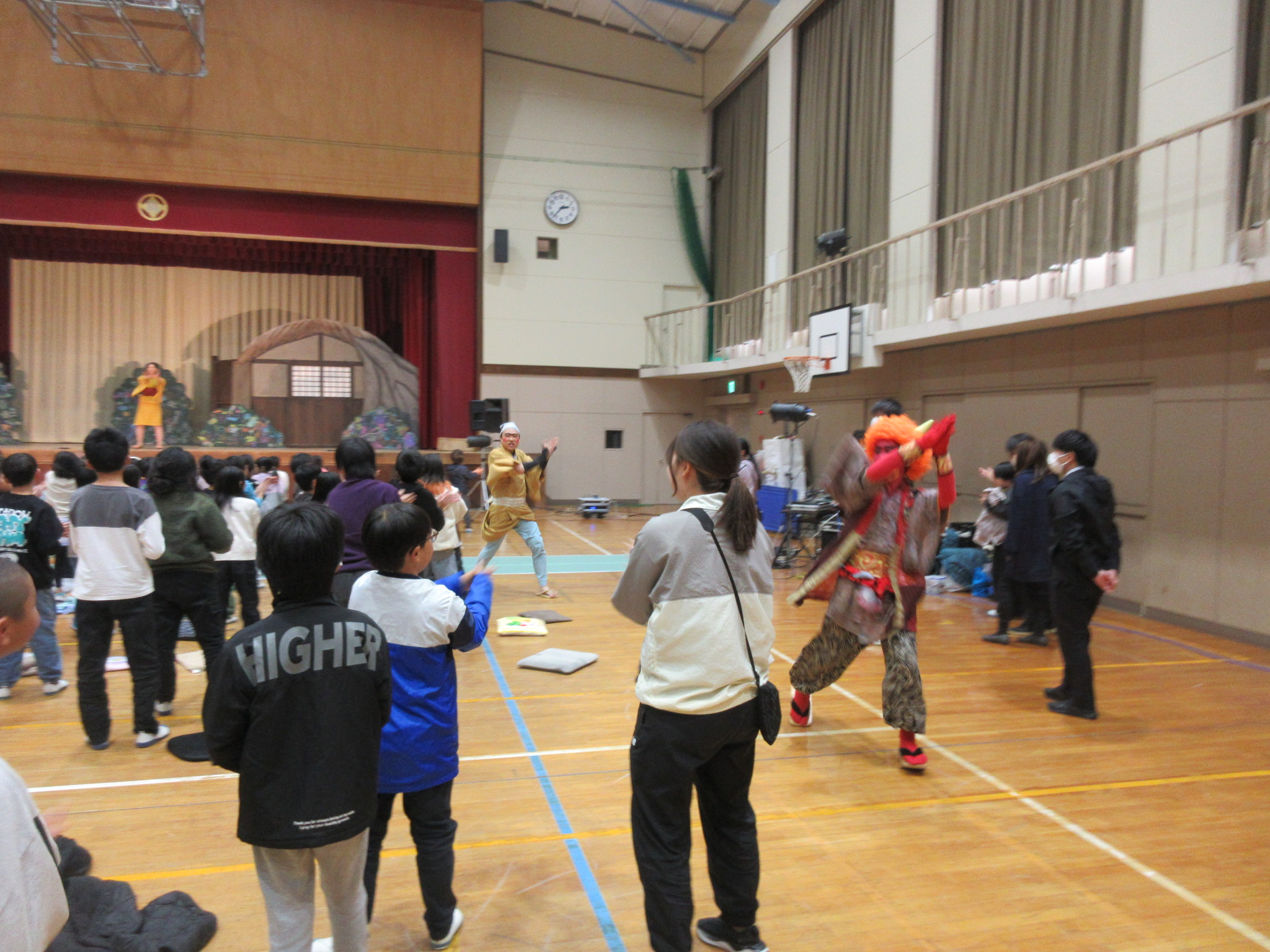 午後に文化庁公演 「ないたあかおに」の演劇を鑑賞します。そのワークショップとして2時間目に、ダンスをしたりステージに配置される大道具に絵をかいたりしました。子どもたちはみんな笑顔で楽しく参加しました。午後からの演劇がより楽しみになったようです。