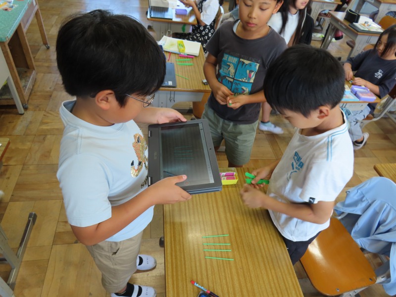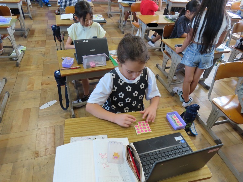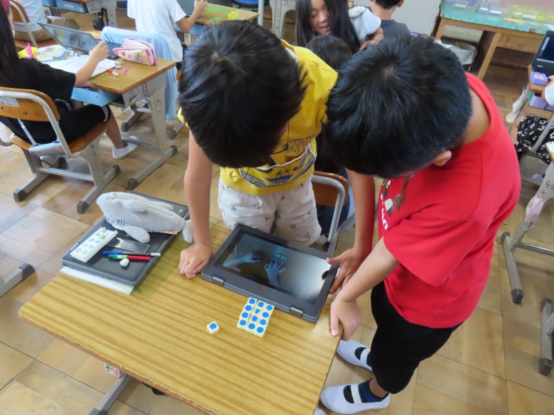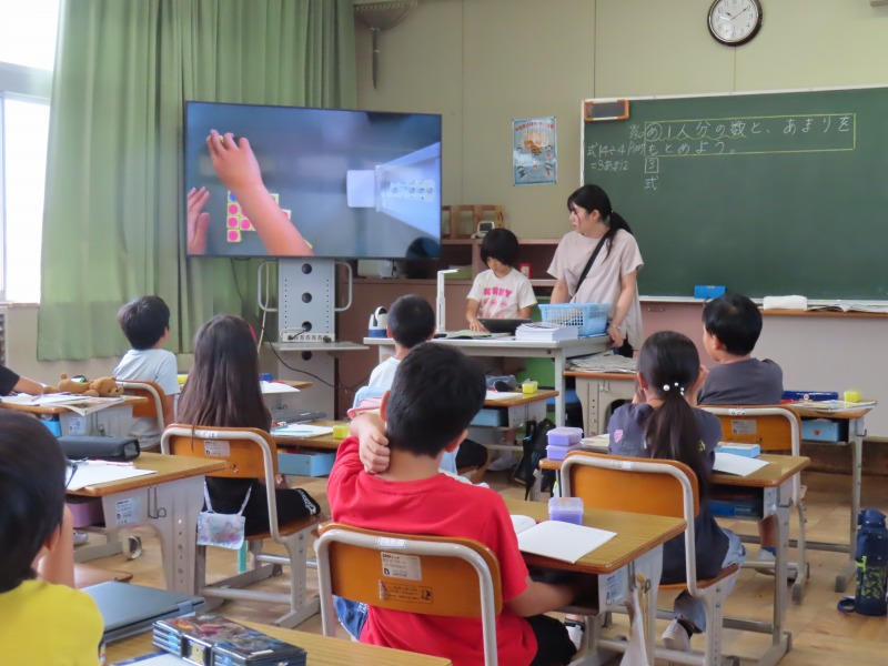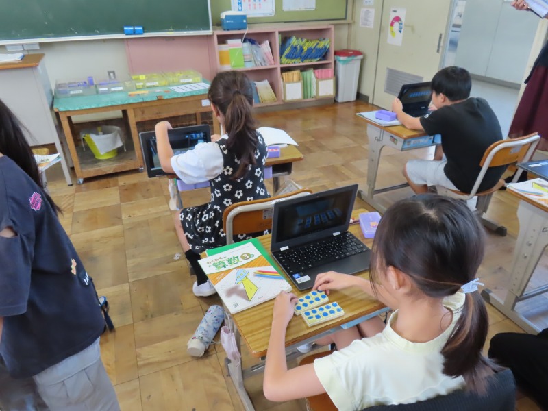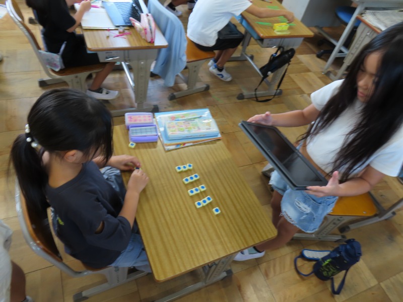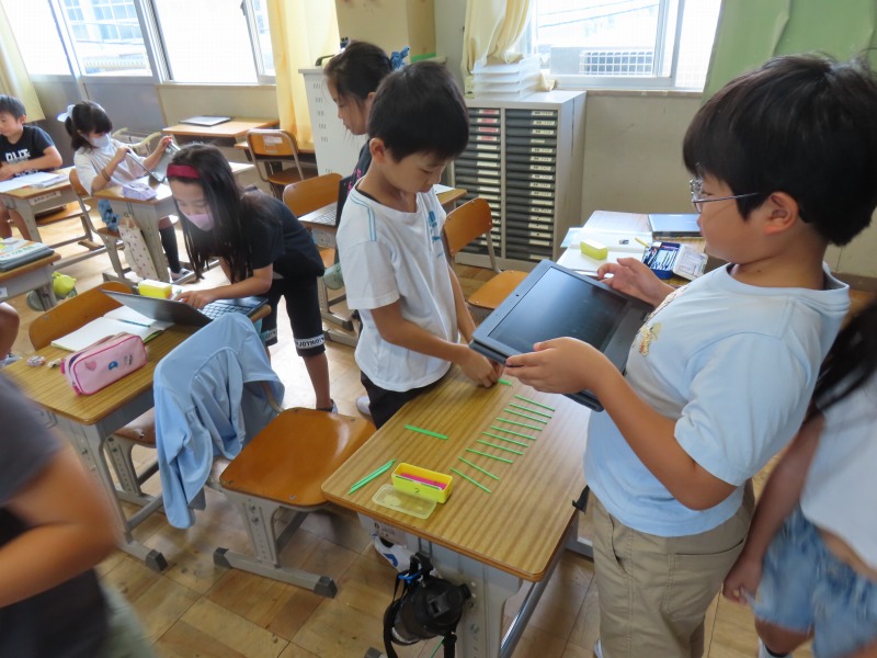 3年生では算数の研究授業が行われました。割り算の仕方をブロックを使って考えます。みな積極的にタブレットを使って説明用の動画を作りました。