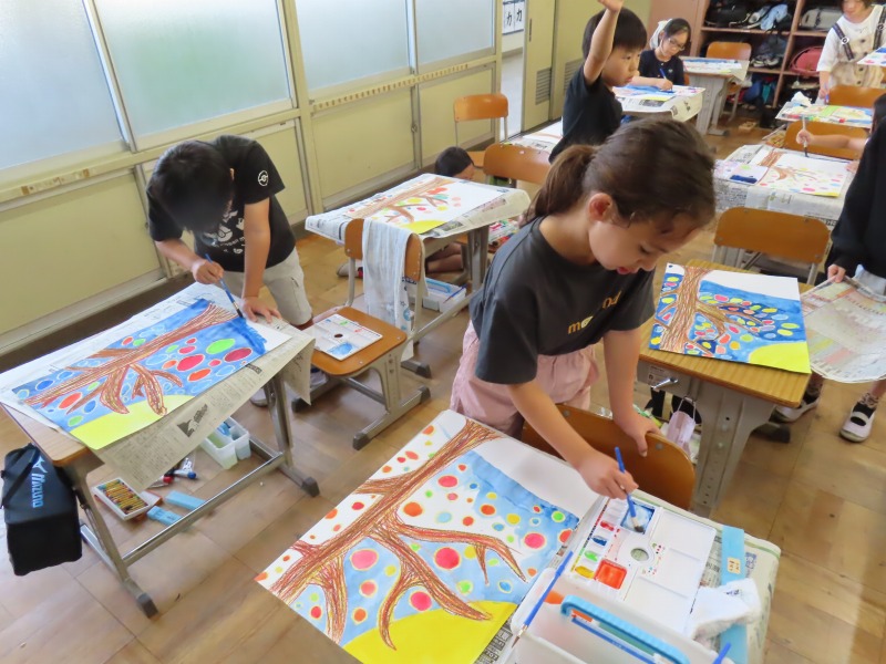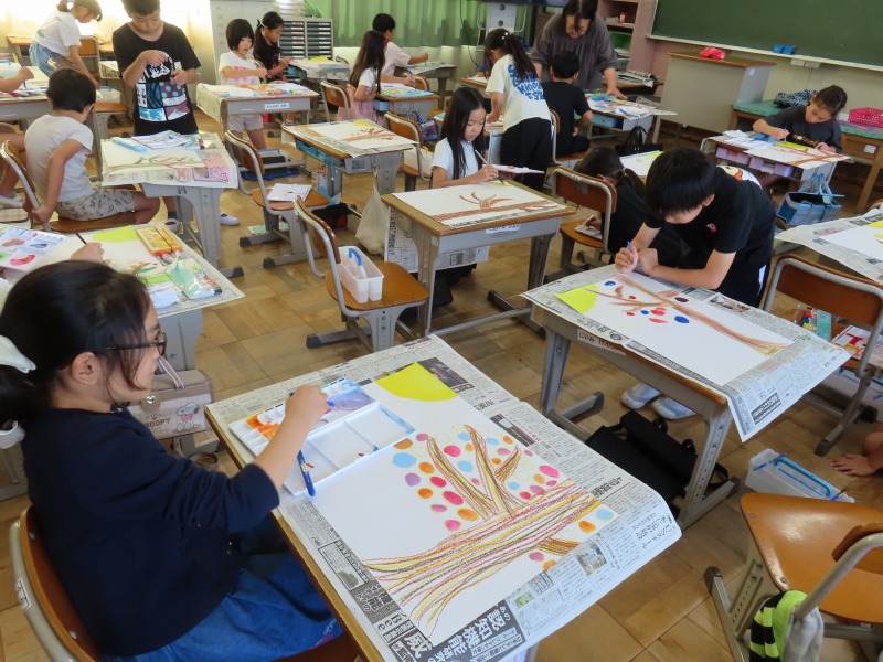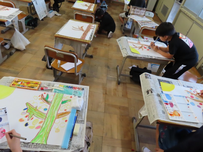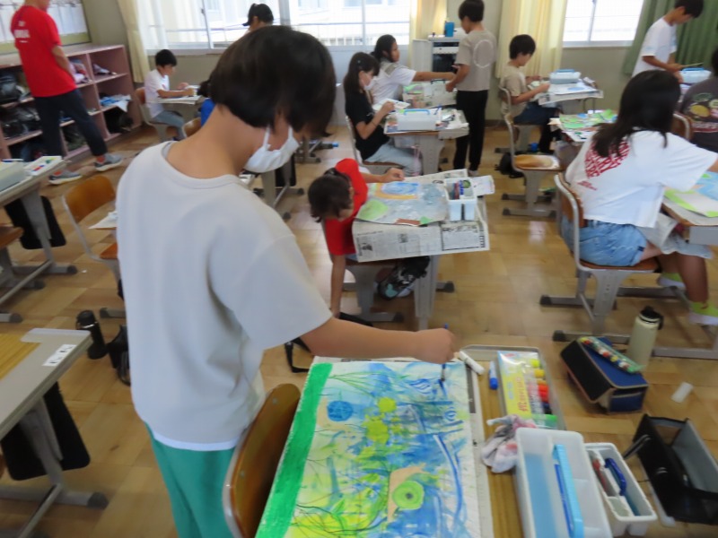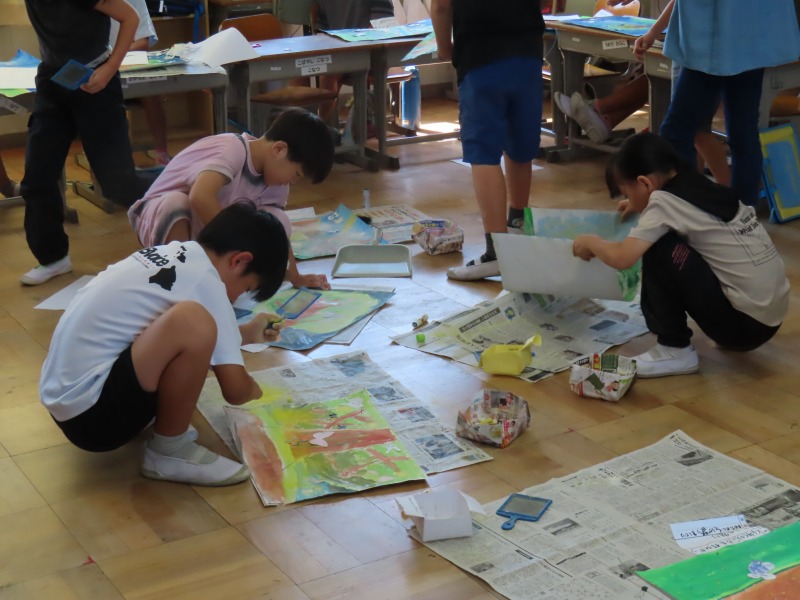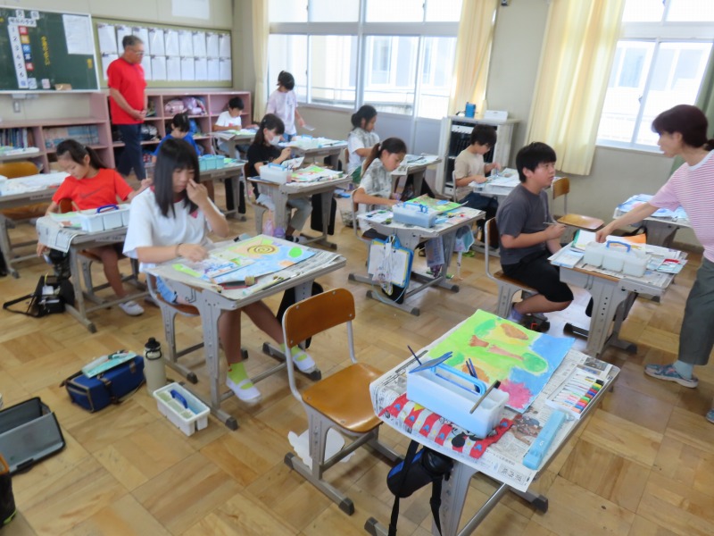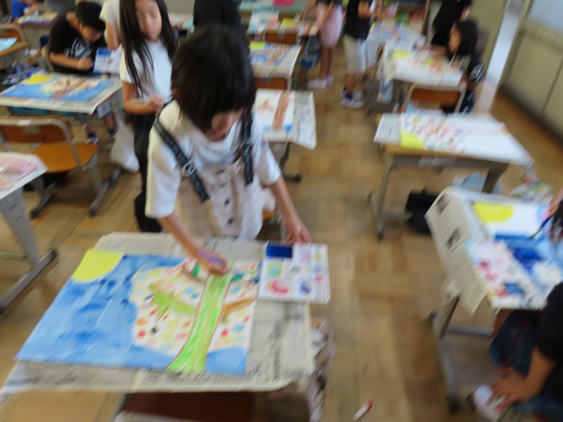 5年生の図工の様子です。歯ブラシや網を使うなどいろいろな技法を活用して絵を描いていました。なかなかの力作です。