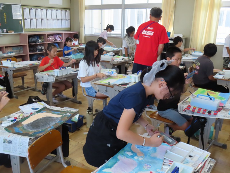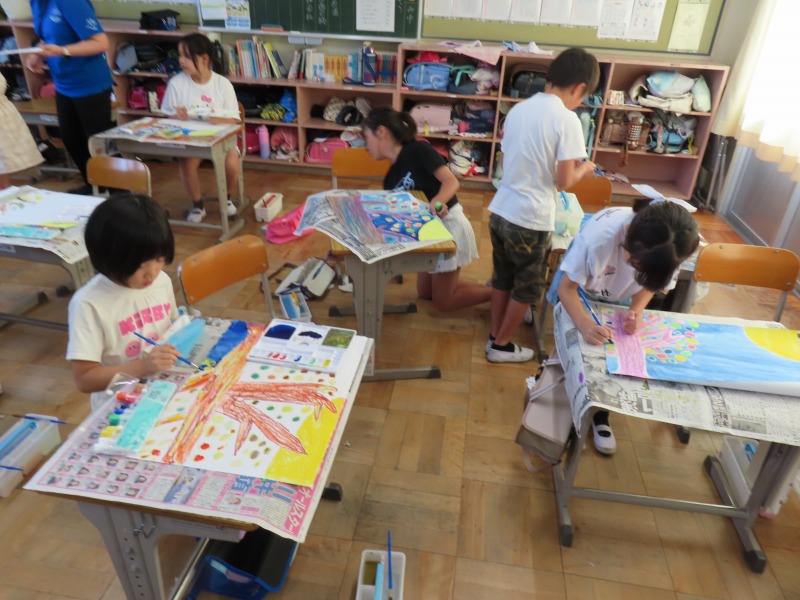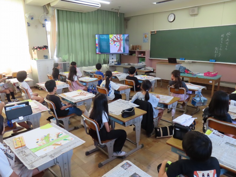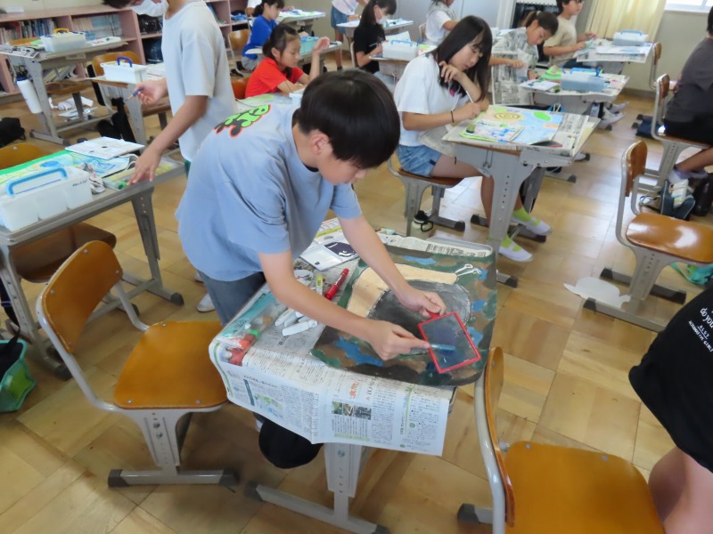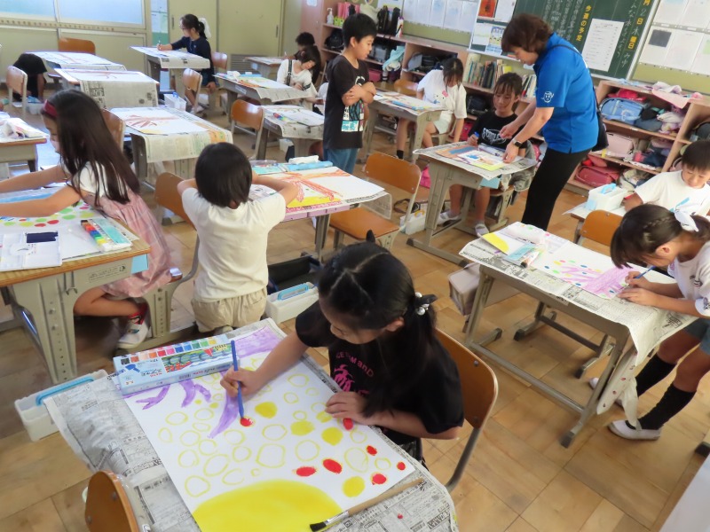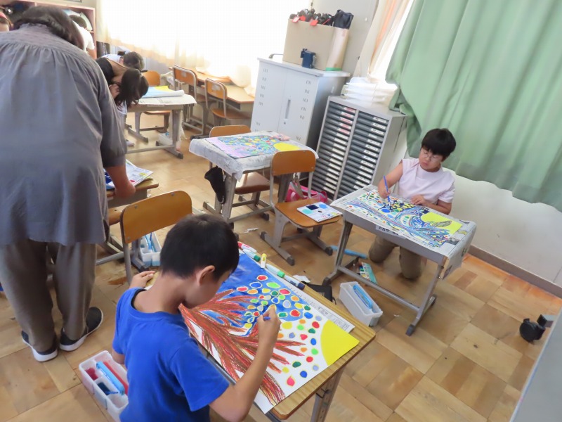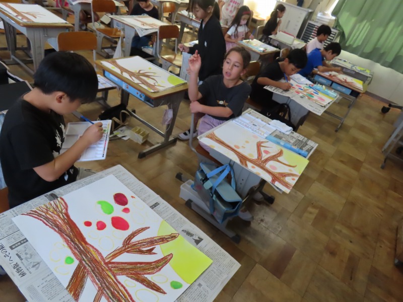 5年生の図工の様子です。歯ブラシや網を使うなどいろいろな技法を活用して絵を描いていました。なかなかの力作です。