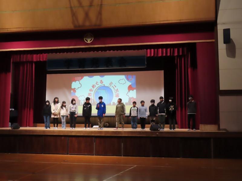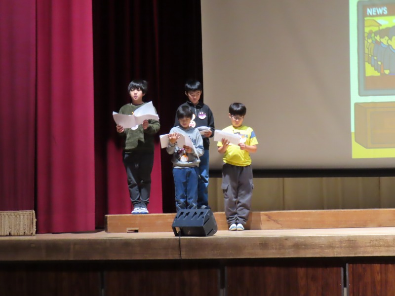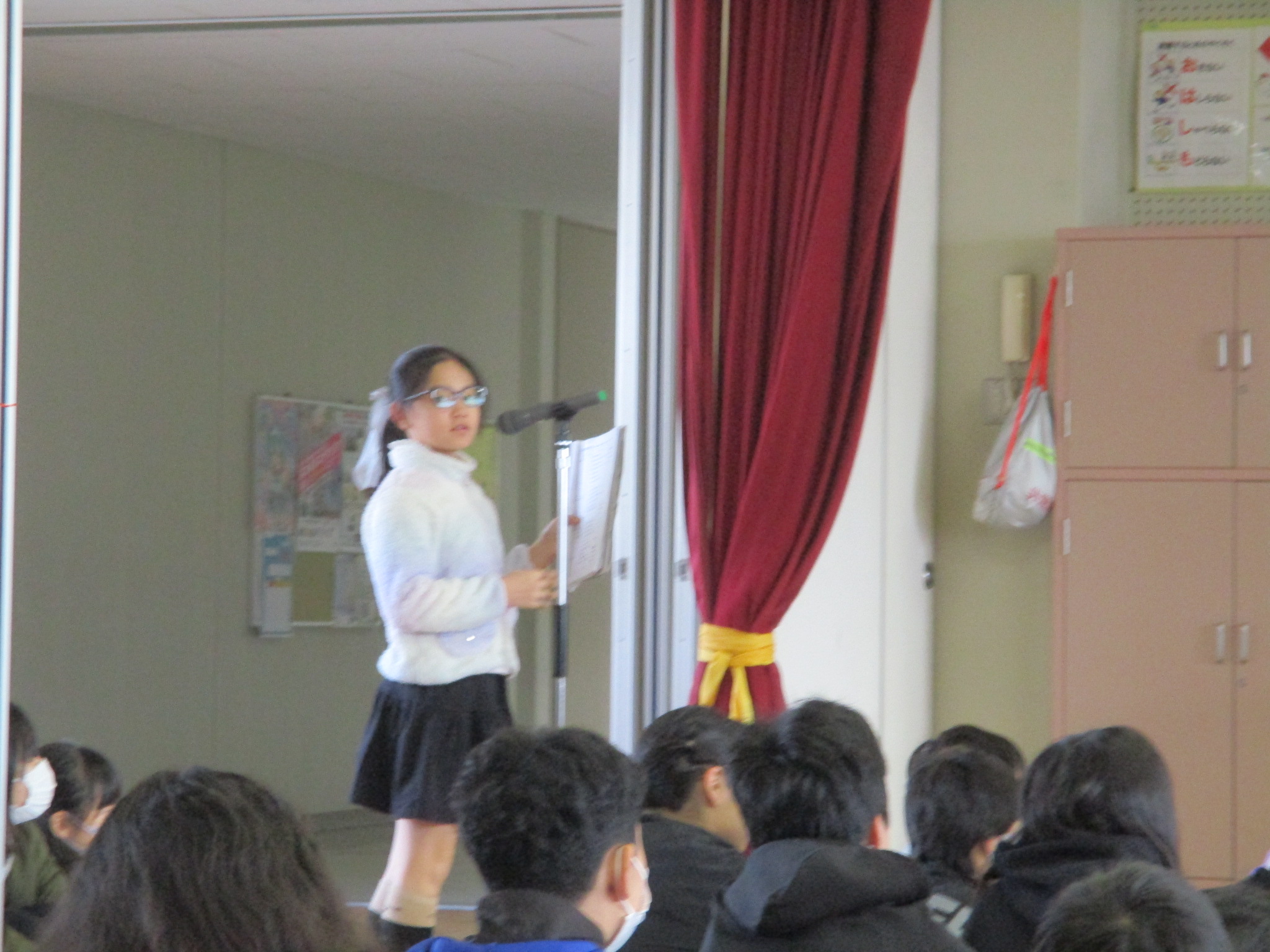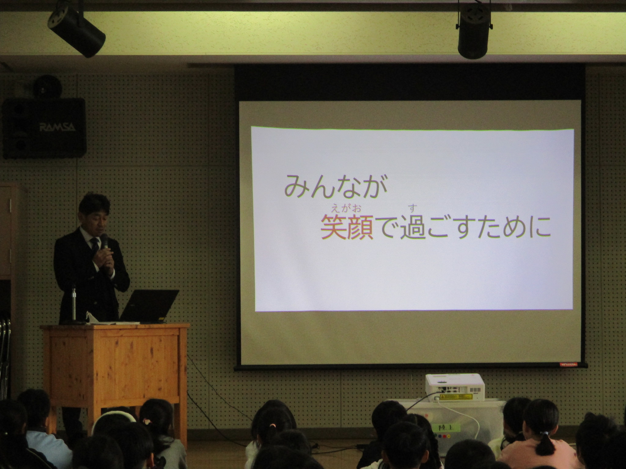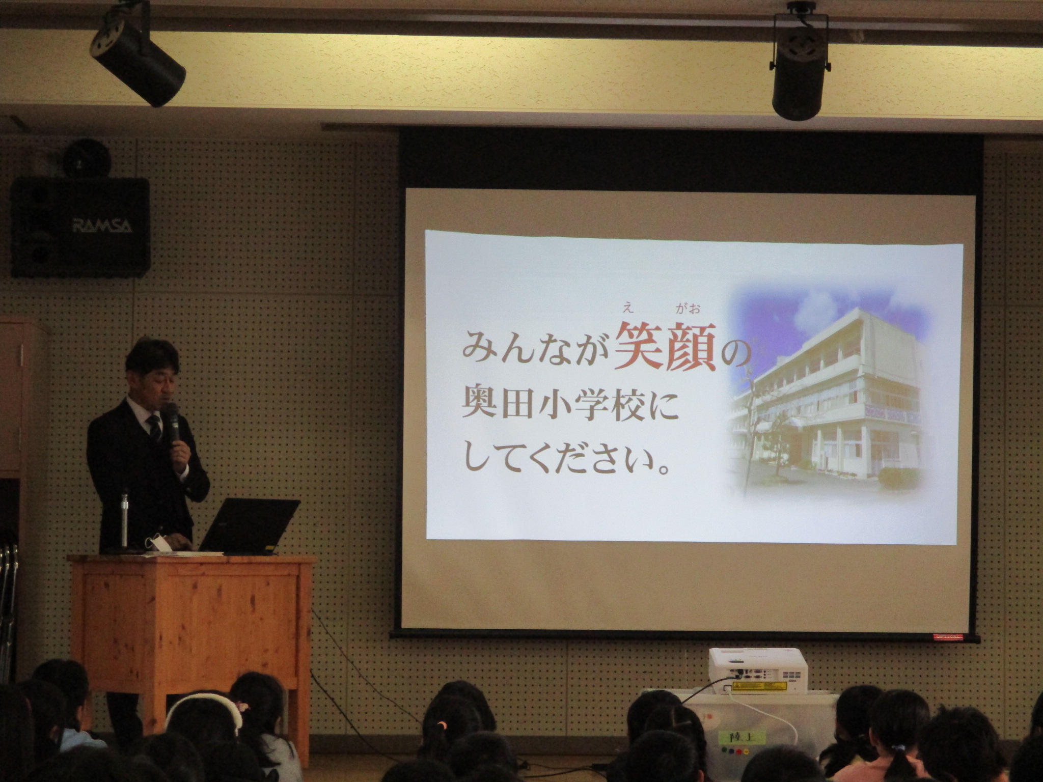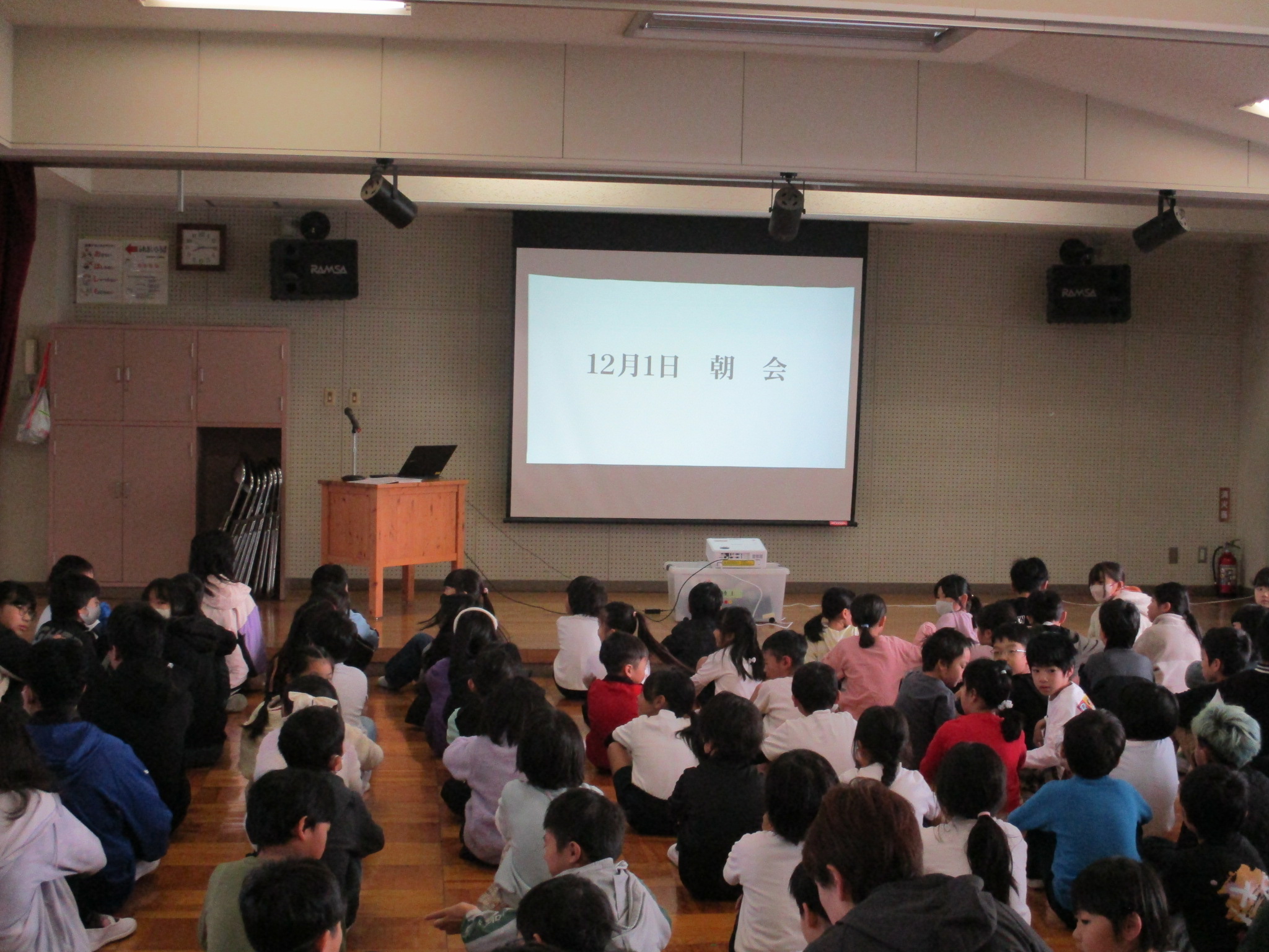 12月4日~10日は人権週間です。「みんなが笑顔で過ごすために」というテーマで、「ともだち」と「いじめ」についての校長講話がありました。また、赤い羽根協賛児童生徒作品コンクールの表彰と奥田地区青少年を守る会主催の標語入賞者の発表がありました。