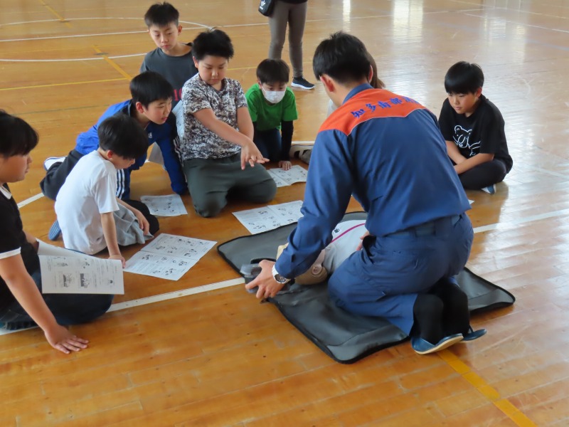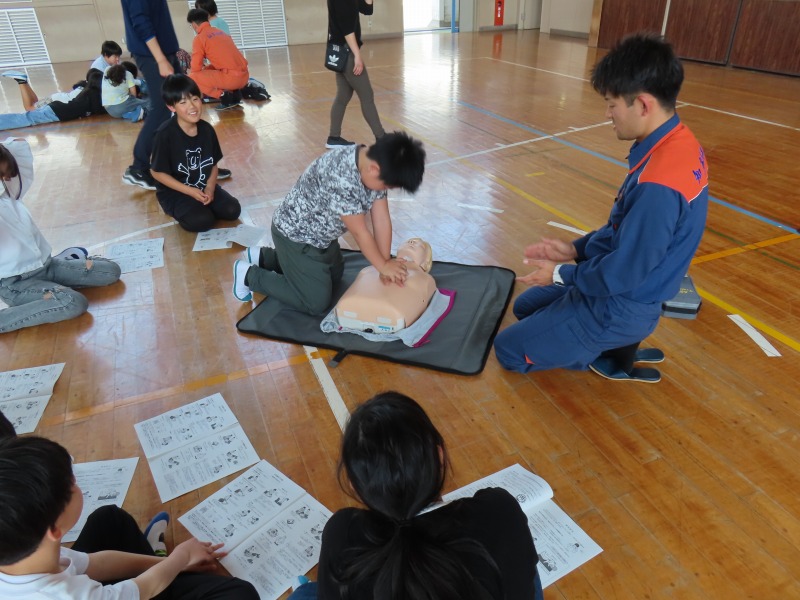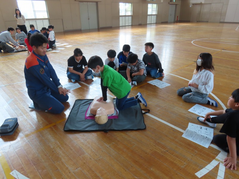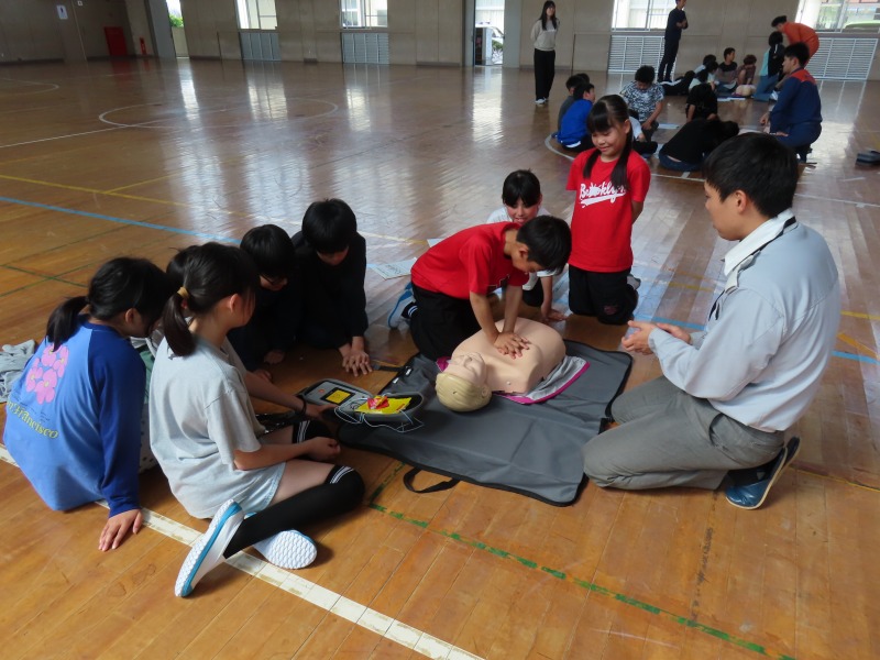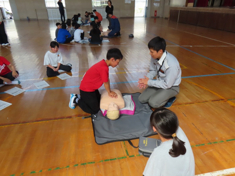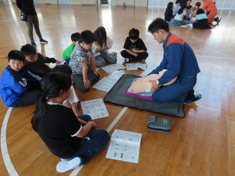 月曜日の午後はどのクラスも道徳です。今日は「あいさつ」や「自分の長所」など話し合っていました。また、5年生は消防署員の救急隊員に方々にきていただき、心肺蘇生法やAEDの使い方を学びました。
