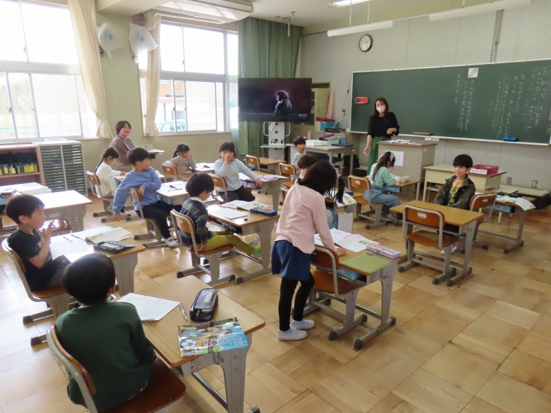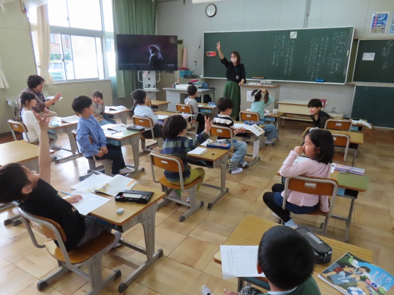 2年生は国語です。みんなで声を合わせて音読をしています。姿勢がよくて気持ちがいいです。