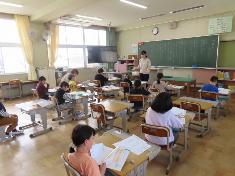 今日の授業の様子です。1年生は元気に校歌の練習をしていました。また、2~6年は年度初めての学力テストをしていました。これは、昨年度までの学習が身についているか調べるものです。3・4年生については担任の先生が研修のため、今日は1日代わりの先生がきてくれています。