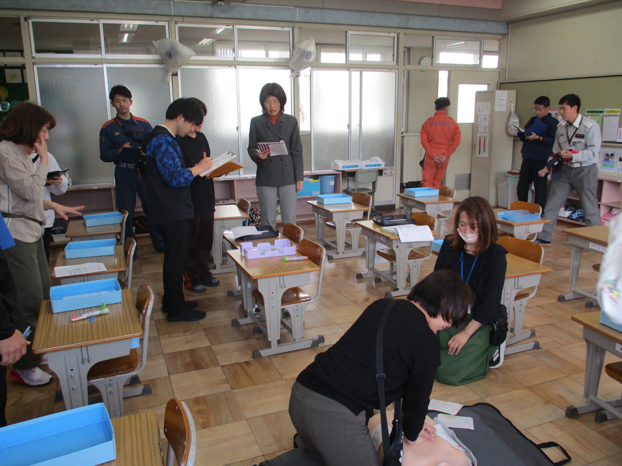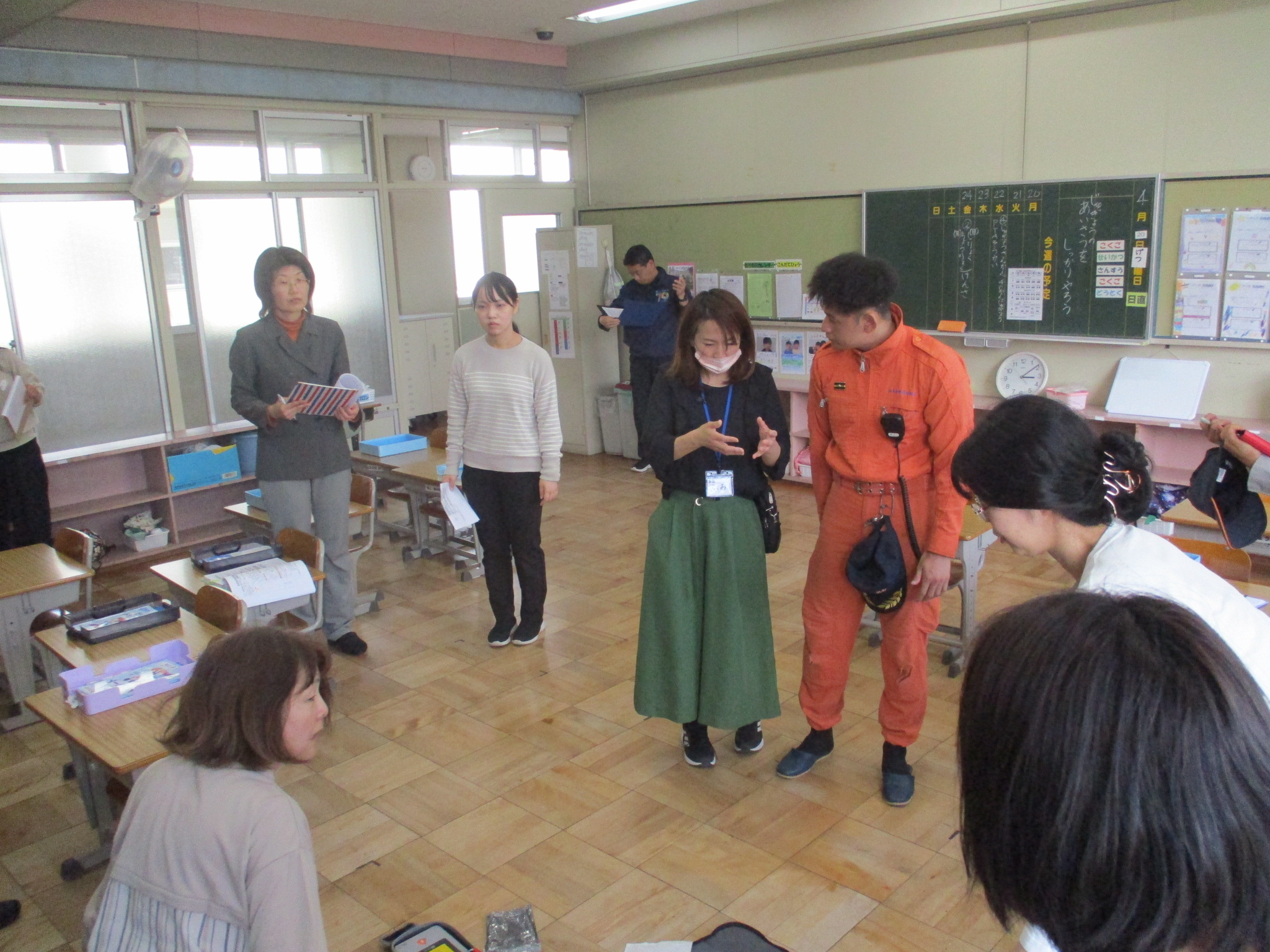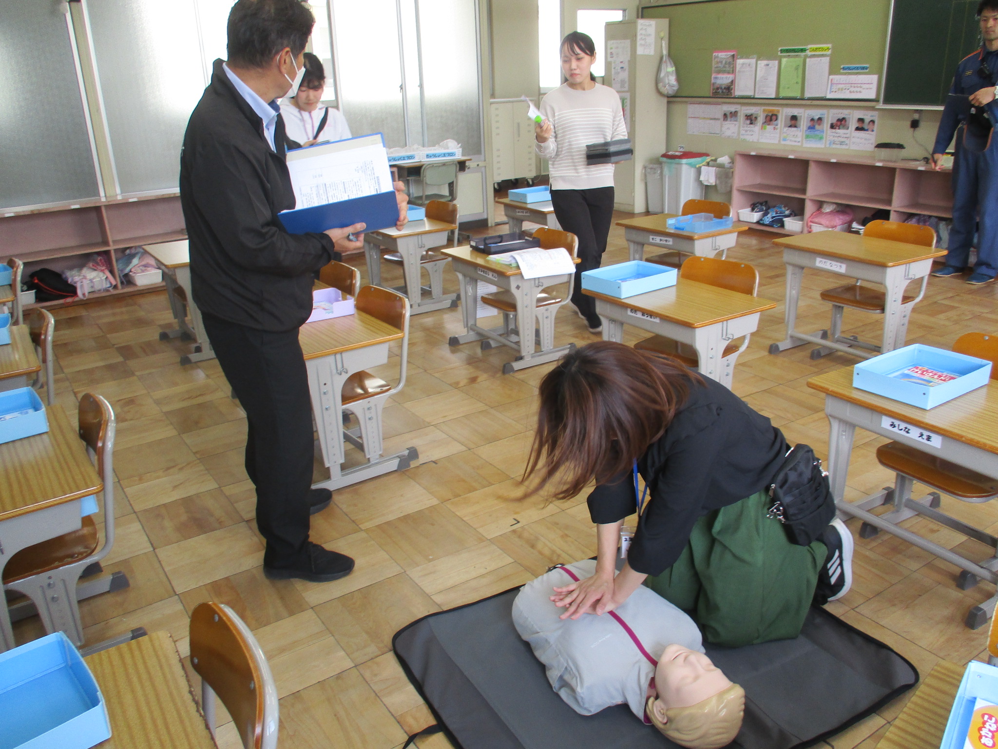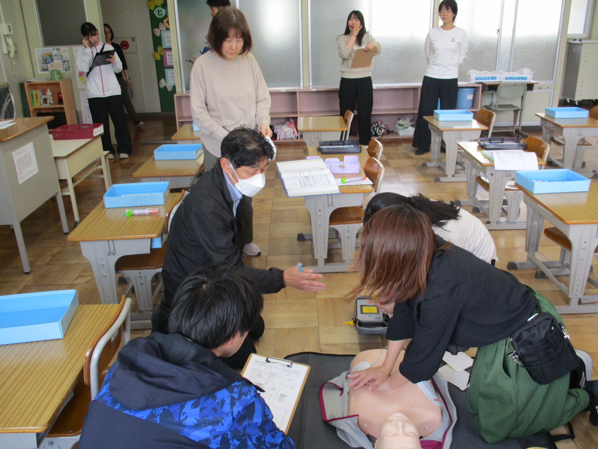 また、子どもたちが下校した後、教職員でいざというときのために緊急対応訓練を行いました。子どもが教室で倒れた設定で、救急車を要請したり、AEDを実際につかってみたりと、確認をしながら訓練できました。