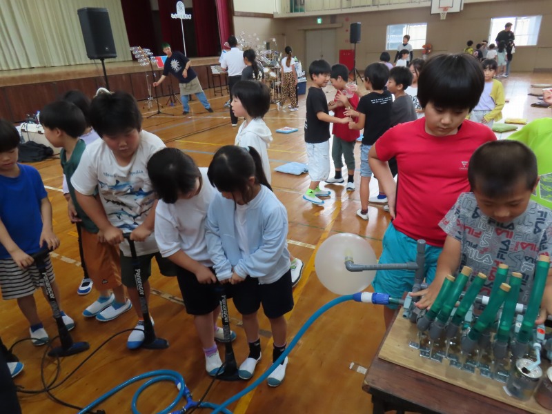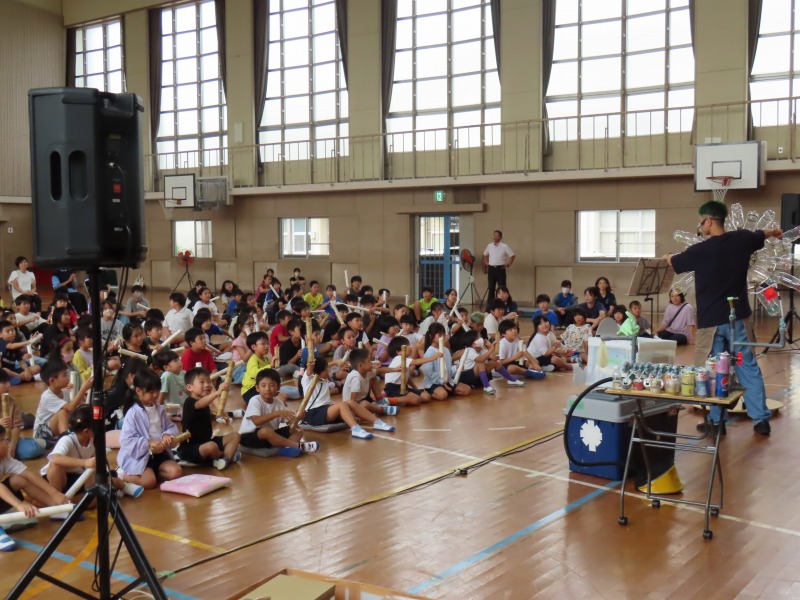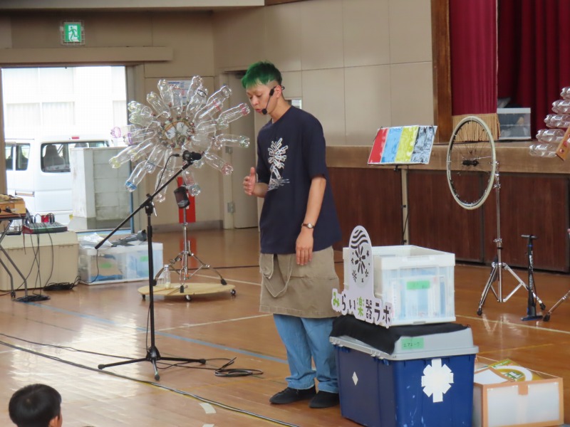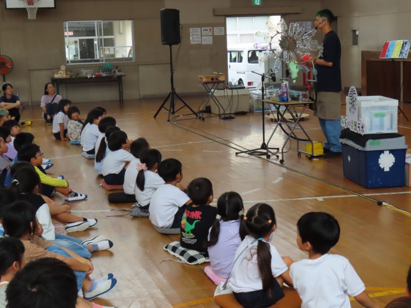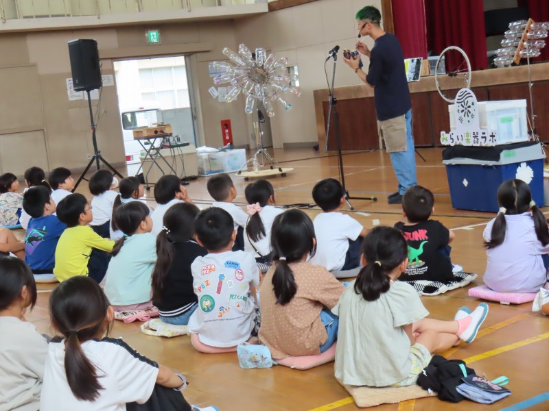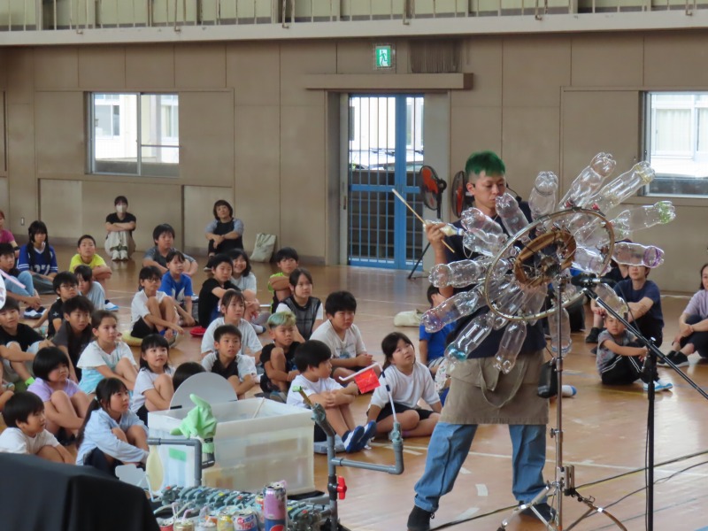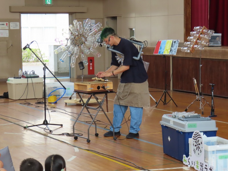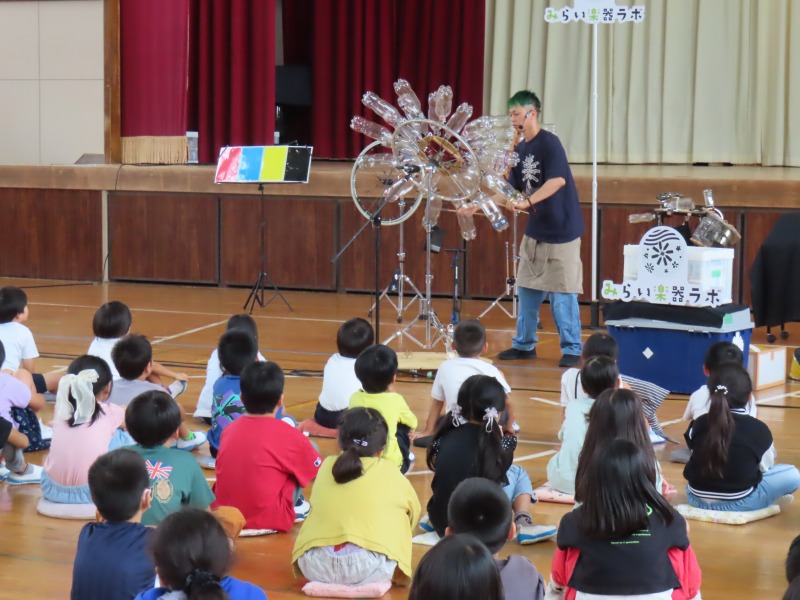 今日はみらい楽器ラボの演奏会が行われました。ペットボトルや段ボール、空き缶などを楽器にしていろいろな曲を演奏してくれました。最後には楽器を体験させてもらい、こどもたちも大満足でした。