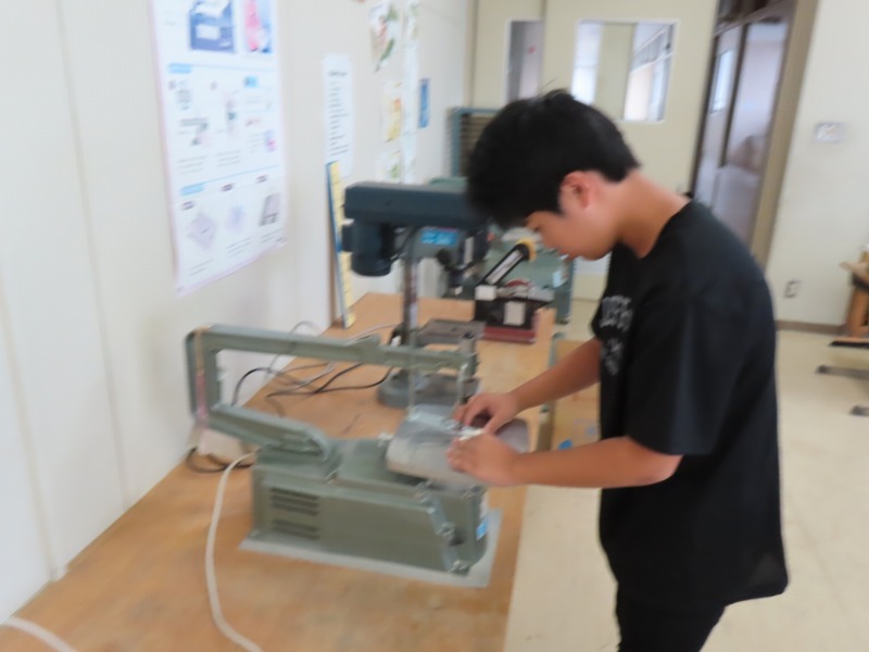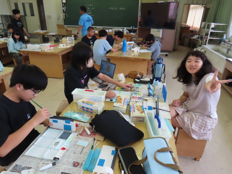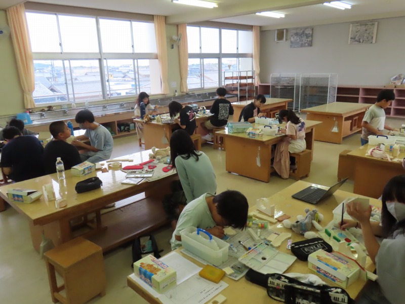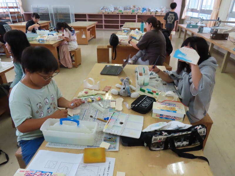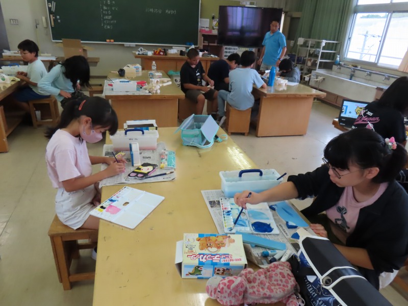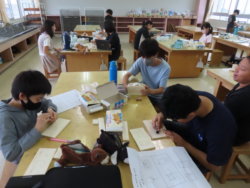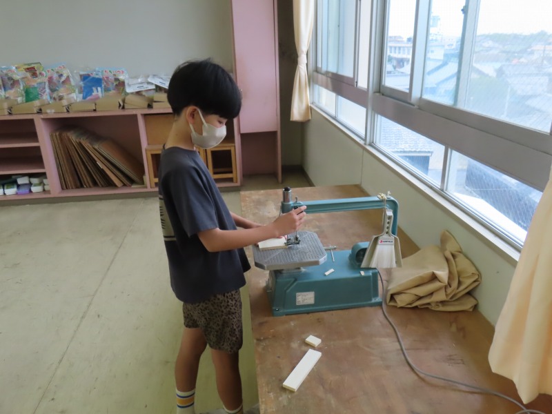 6年生の図工の様子です。テープカッターの製作で、木材に色を塗ったり、木材を糸のこ盤で切ったりしています。みんな作品作りに集中しています。