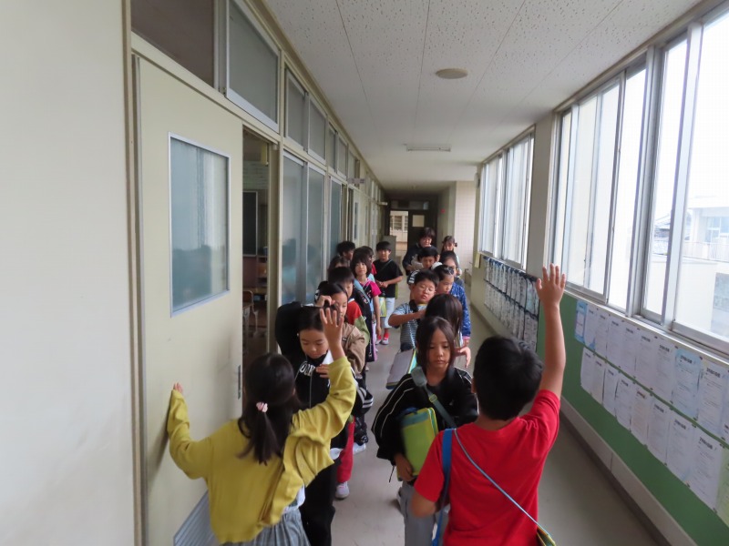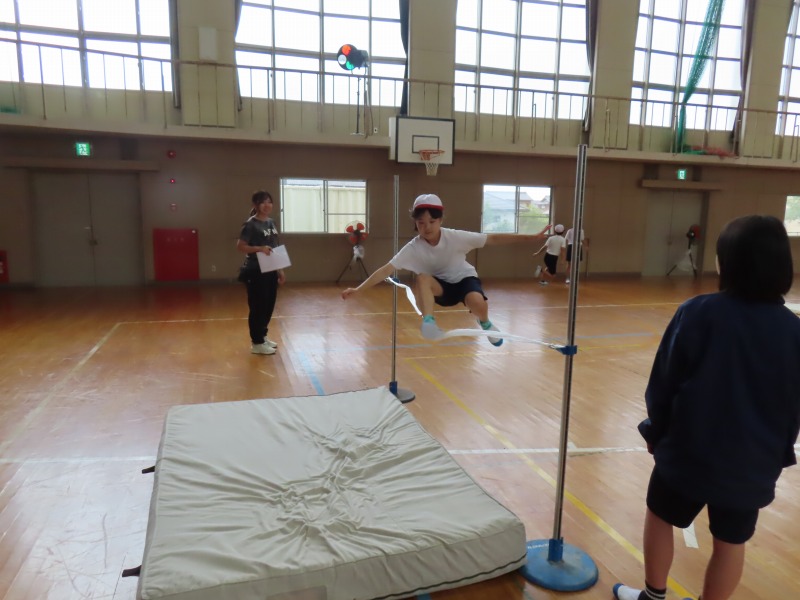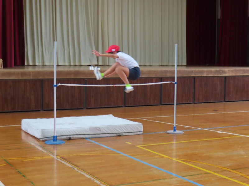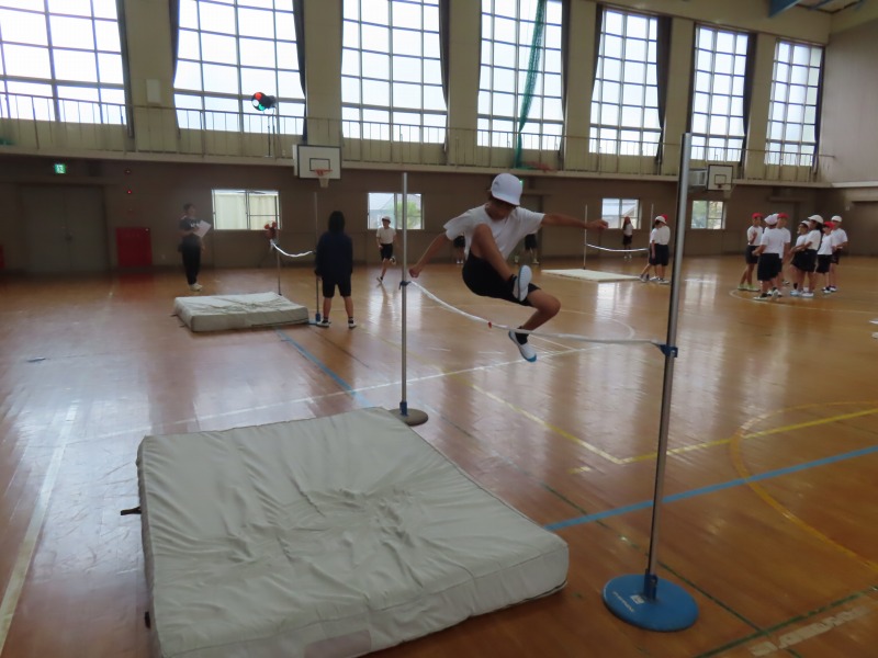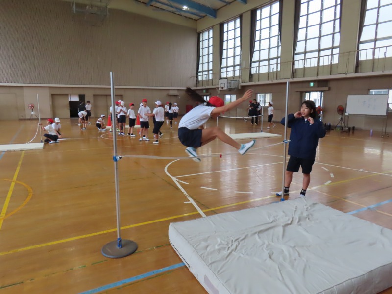 5・6年生の体育では高跳びの練習をしていました。思い切って跳べるように、バーは棒ではなくビニル紐です。みんな安心して跳んでいました。