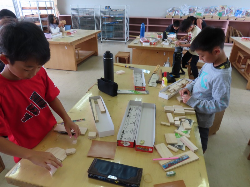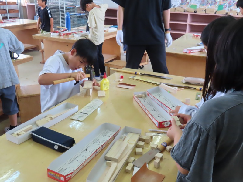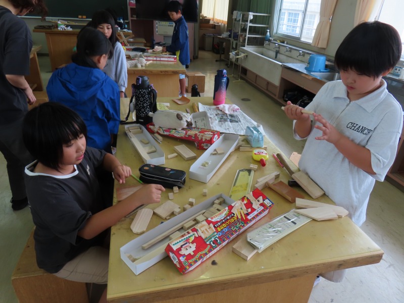 4年生の図工の様子です。のこぎりを使って角材を切断したり、釘をうったりしながら思い思いの作品を作っています。
