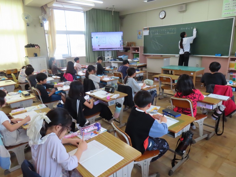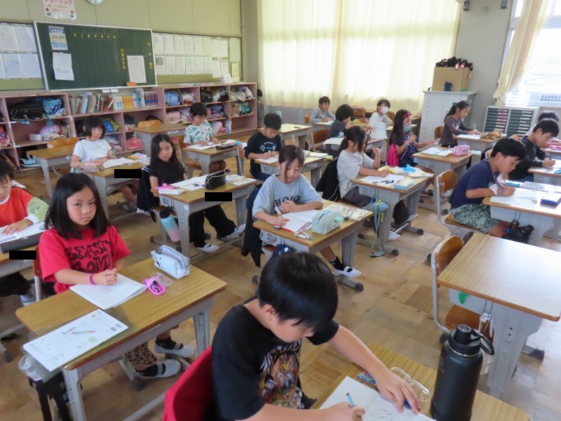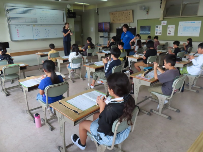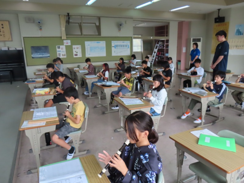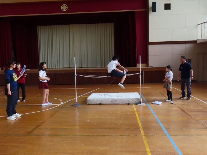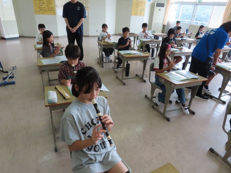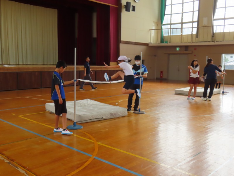 運動会を土曜日に無事終え、少し疲れの残る月曜日ですが、みんな元気に活動しています。体育では、跳び箱のテストや高飛びの記録会などが行われていました。教室でも算数や国語など、真剣に取り組む様子が見られます。音楽では「もののけ姫」をリコーダーで合奏しています。とても上手に吹けています。
