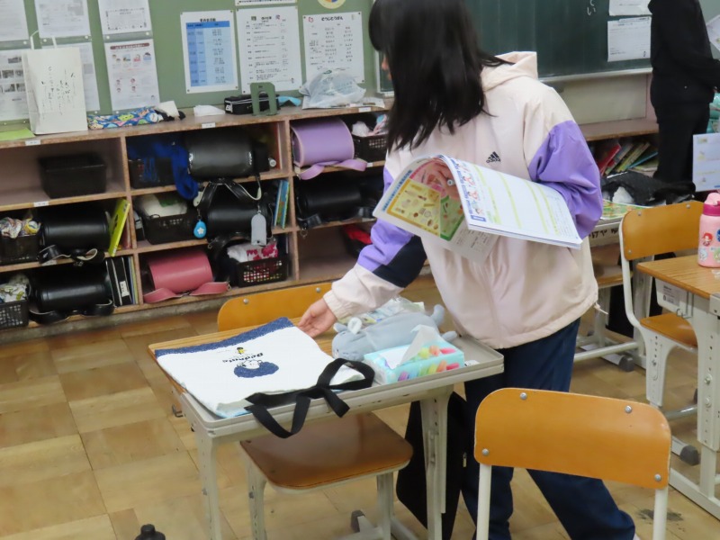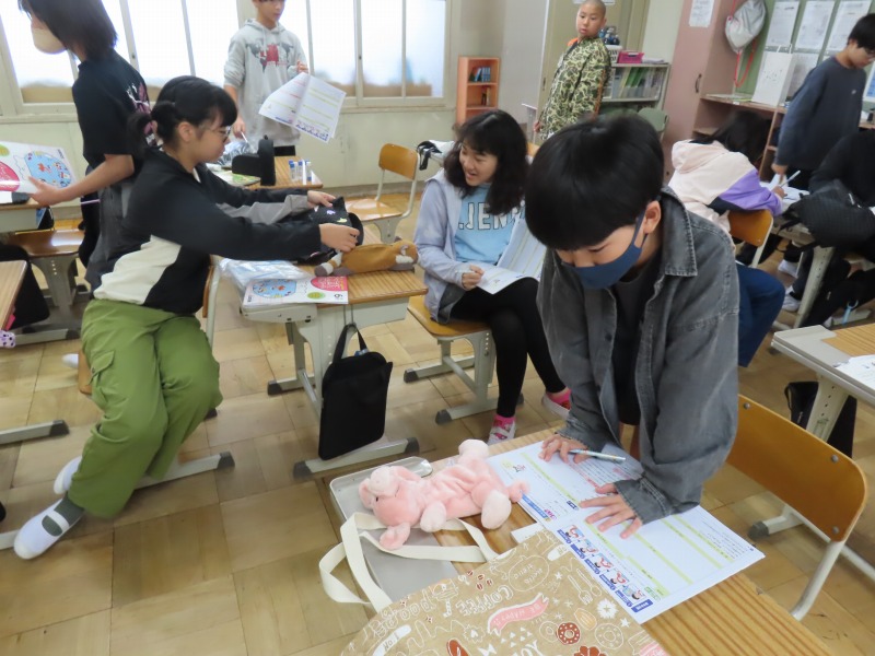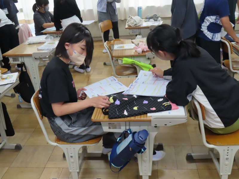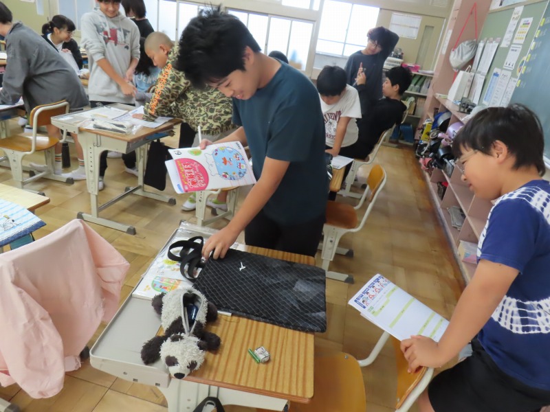 6年生の家庭科の様子です。先日ミシンを使って製作した手提げかばんを互いに評価し合っていました。どの作品もとても上手にできていました。