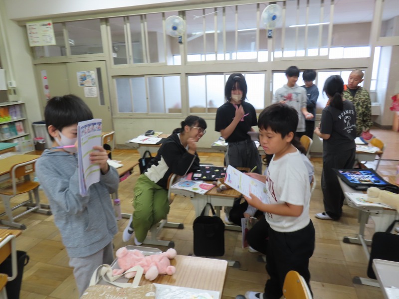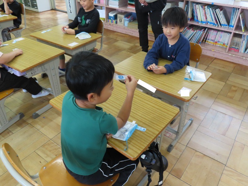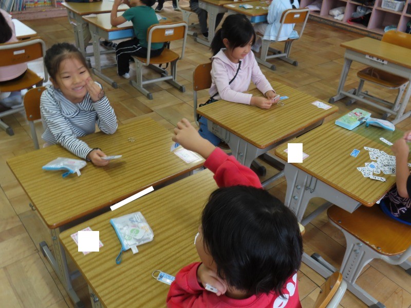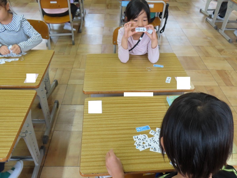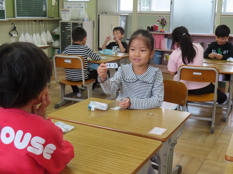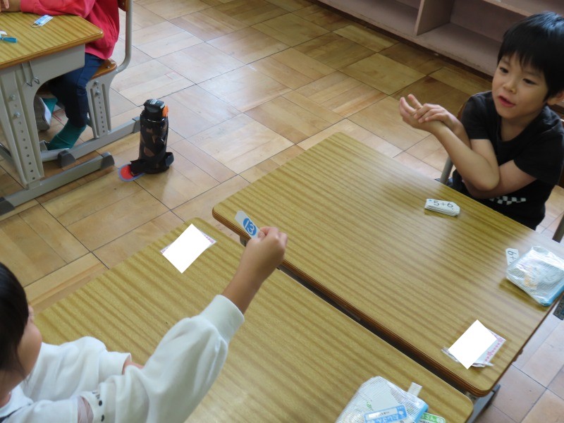 1年生の算数の様子です。ペアで、カードを使って問題を出し合っています。