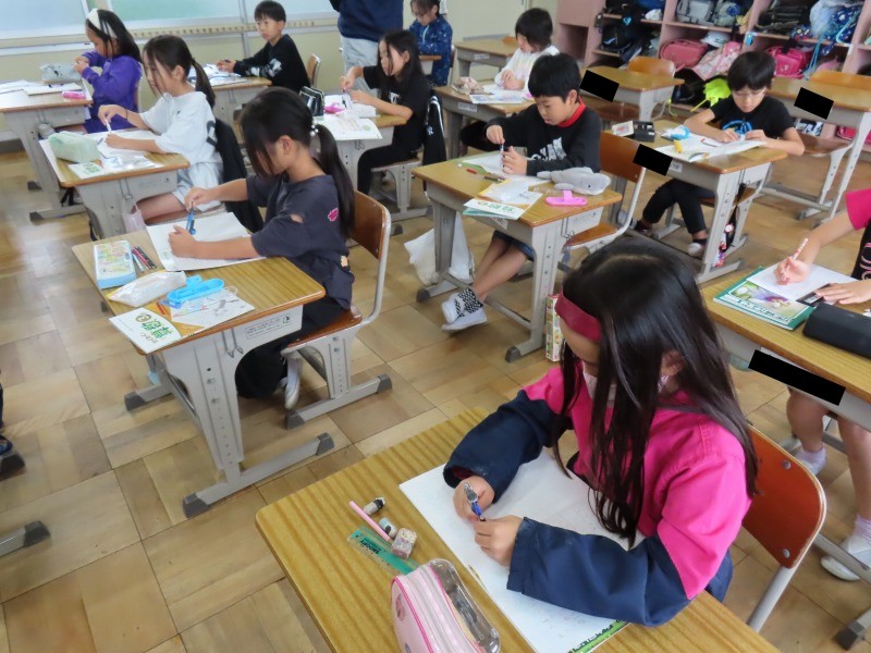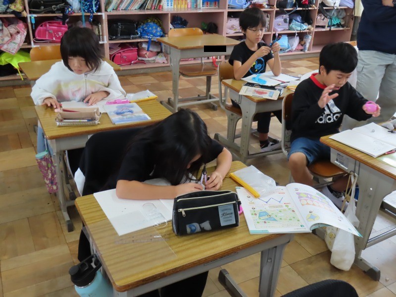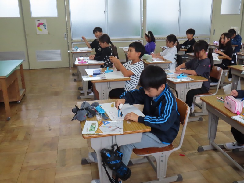 3年生はコンパスを使って図形を描いています。苦労しながらも課題である図形を描くことができました。
