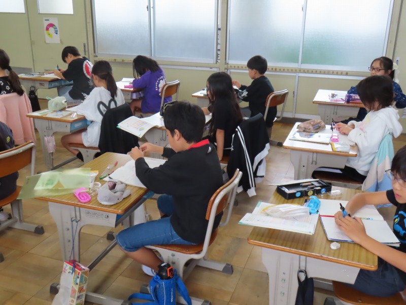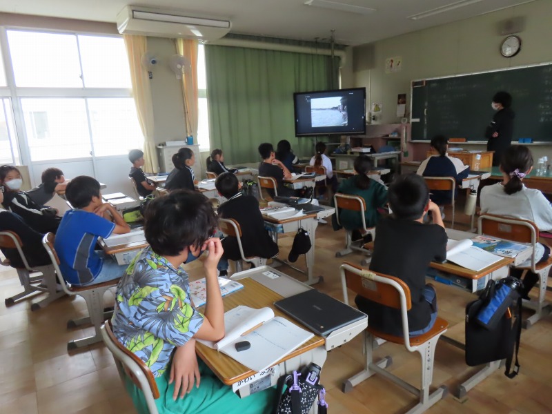 5年生は理科の様子です。ちょうど川の流れが雨量によってどのように変わるかを動画見ていました。とても分かりやすい動画で学びにつながっています。