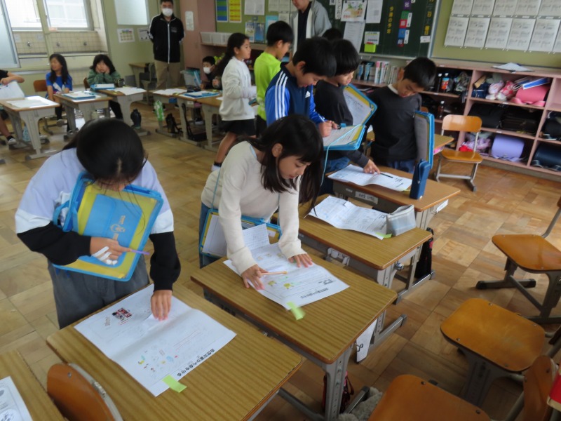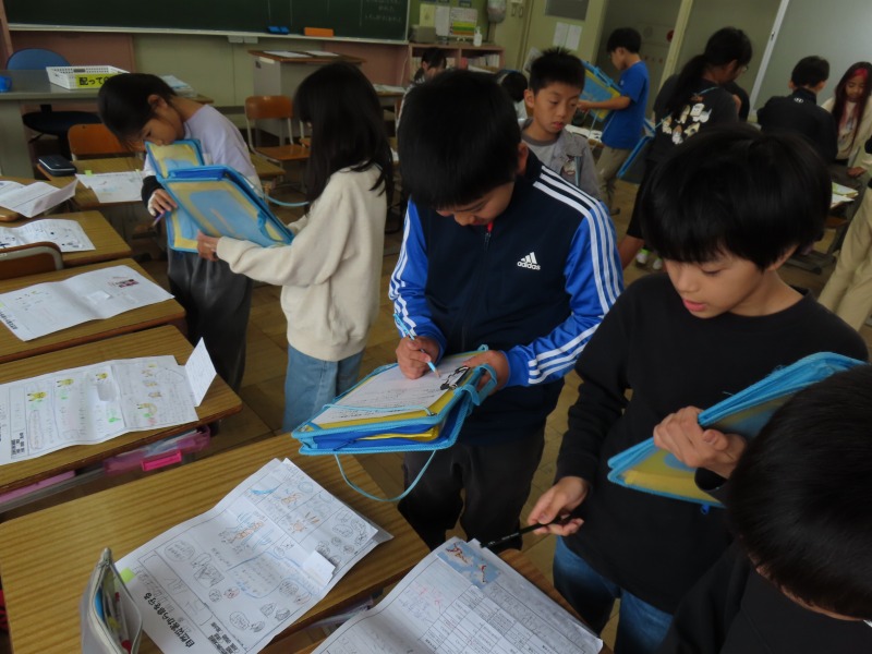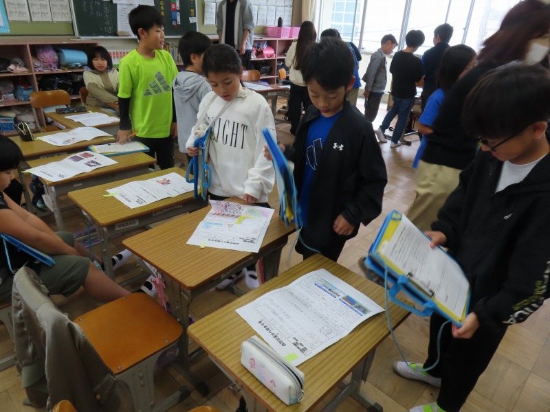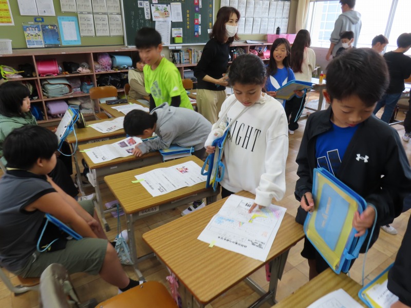 4年生は社会で作った防災に関わる新聞を互いに評価し合います。とても分かりやすい新聞ばかりです。